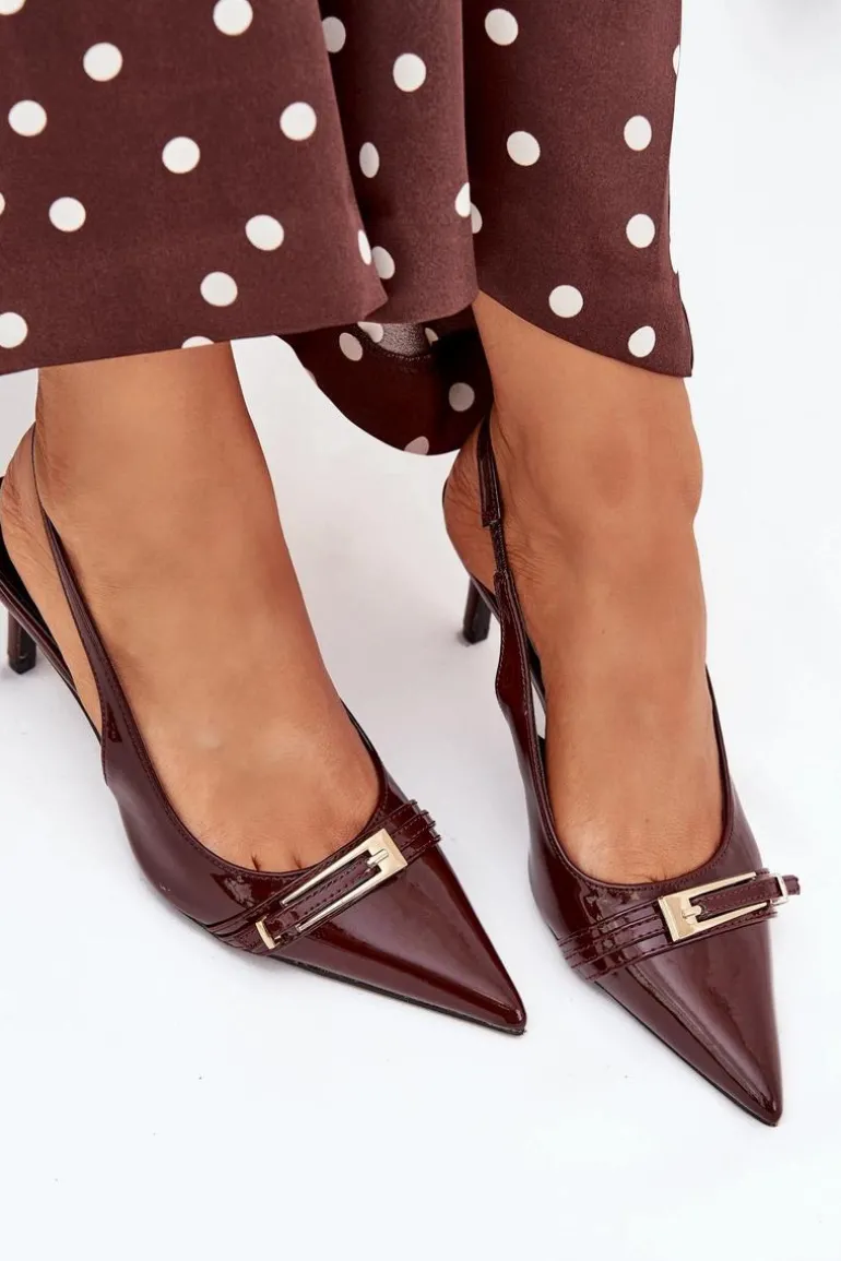 Stylowe i eleganckie czółenka z eko skóry, osadzone na obcasie w formie szpilki, to połączenie klasyki z nowoczesnym akcentem. Z przodu buta znajduje się paseczek ozdobiony złotą klamrą, który dodaje im wyjątkowego szyku. Szpiczaste noski optycznie wysmuklają nogi, nadając sylwetce elegancki wygląd. Idealne na wieczorne wyjścia, specjalne okazje lub eleganckie spotkania. Przy wyborze rozmiaru prosimy kierować się tabelą rozmiarów