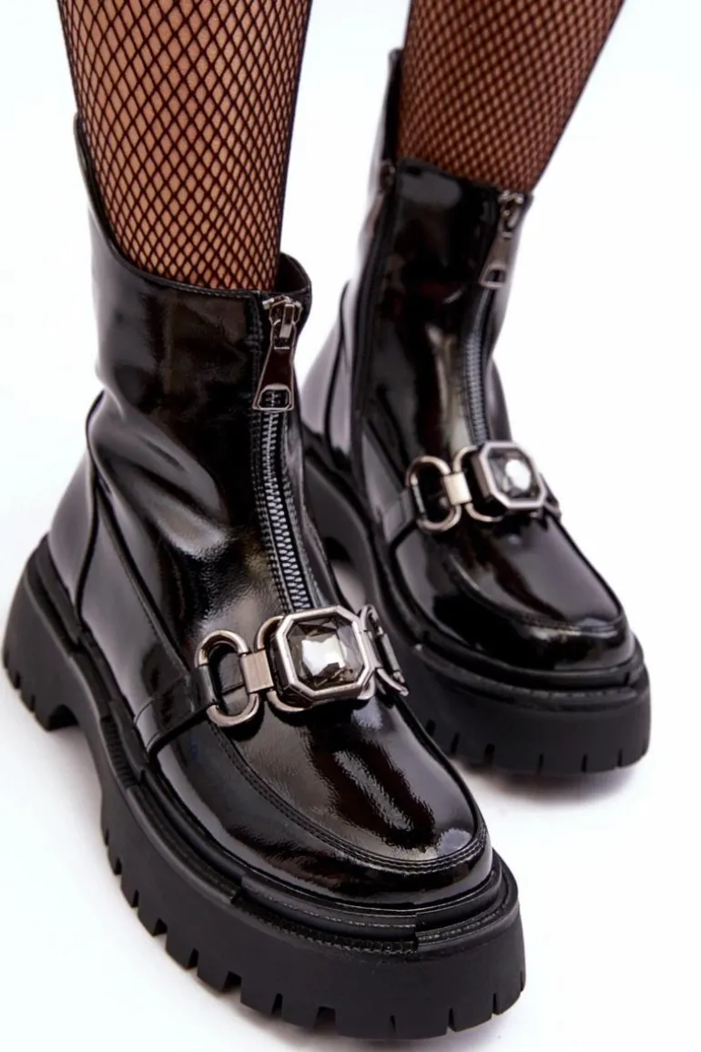 Piękne, damskie botki zostały wykonane z wysokiej jakości eko skóry. Osadzono je na płaskim obcasie. Przód obuwia został wzbogacony modnym kryształem. Wnętrze obuwia ocieplono miękkim kocem obuwniczym. Model ten jest zapinany na suwak z boku oraz dodatkowo posiada na przodzie imitację zamka. Zapiętek w tych butach został usztywniony. Przy wyborze rozmiaru prosimy sugerować się tabelą rozmiarów.