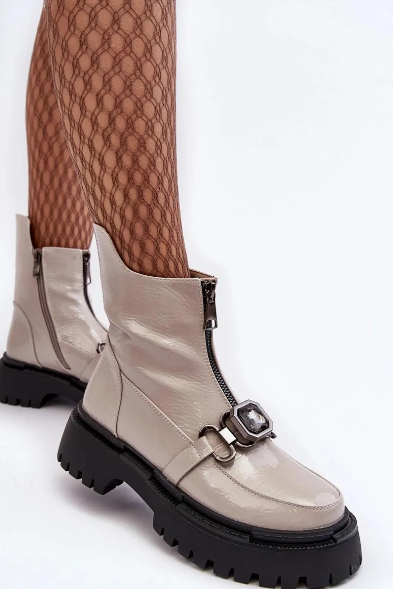 Piękne, damskie botki zostały wykonane z wysokiej jakości eko skóry. Osadzono je na płaskim obcasie. Przód obuwia został wzbogacony modnym kryształem. Wnętrze obuwia ocieplono miękkim kocem obuwniczym. Model ten jest zapinany na suwak z boku oraz dodatkowo posiada na przodzie imitację zamka. Zapiętek w tych butach został usztywniony. Przy wyborze rozmiaru prosimy sugerować się tabelą rozmiarów.