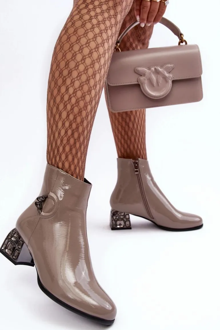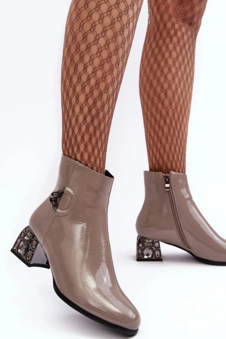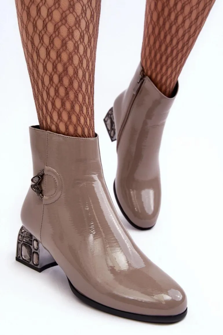 Lakierowane Damskie Botki Na Zdobionym Obcasie D&A MR870-93 Szare