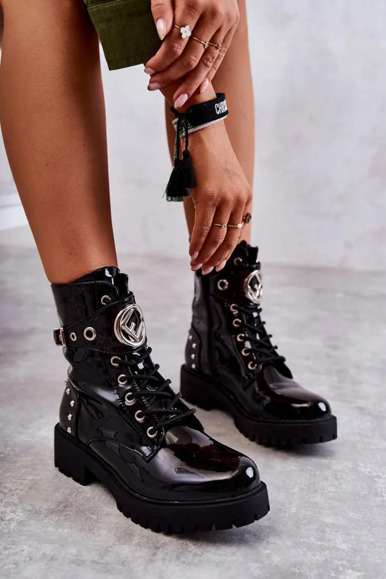 Modne damskie botki świetnie sprawdzą się podczas jesiennych stylizacji! Wykonane z eko skóry. Dodatkowo zostały przyozdobione ćwiekami oraz emblematem z tworzywa sztucznego. Botki posiadają klasyczne wiązanie oraz suwak. W środku znajduje się ocieplenie w postaci koca obuwniczego. Osadzone na płaskim obcasie oraz platformie. Przy wyborze rozmiaru prosimy sugerować się tabelą rozmiarów.