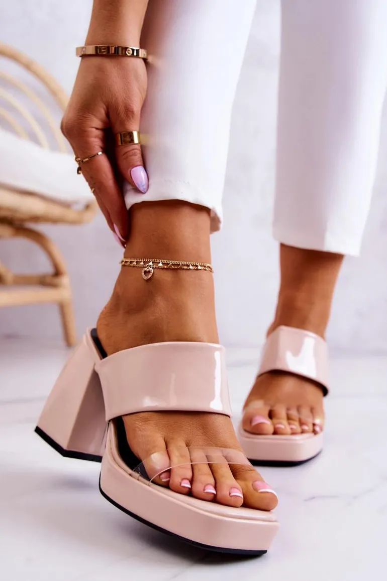 Klapki na wyjątkowym, szerokim obcasie w postaci słupka. Przód osadzony na platformie z otwartym, kwadratowym noskiem. Stopę podtrzymują dwa paski. Model klasyczny, wsuwany, z odkrytą piętą. Wykonane w całości z eko skóry. Posiadają miękką, eko skórzaną wkładkę. W tych butach na pewno zachwycisz wiele osób! Stylowe, komfortowe w użytkowaniu oraz stabilne. Ten model powinien znaleźć się właśnie u Ciebie! Przy wyborze rozmiaru prosimy kierować się tabelą rozmiarów.