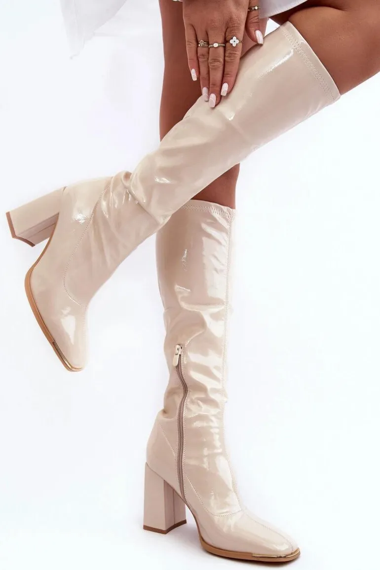 Kozaki damskie z cholewką przed kolano. Wykonane z eko skóry. Osadzone na obcasie w postaci słupka. Noski w kwadrat. Nieocieplane. Model wsuwany z dodatkowym suwakiem na dole cholewki. Idealny model zarówno do sukienek, jak i spodni! Przy wyborze rozmiaru prosimy sugerować się tabelą rozmiarów.