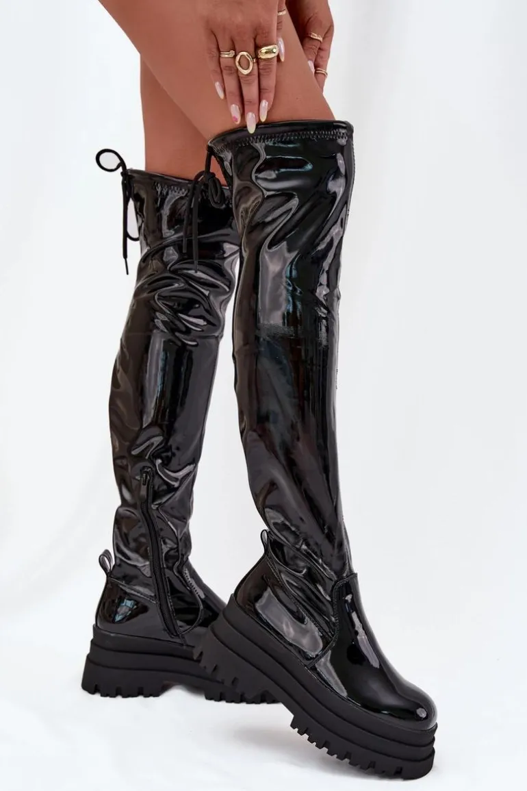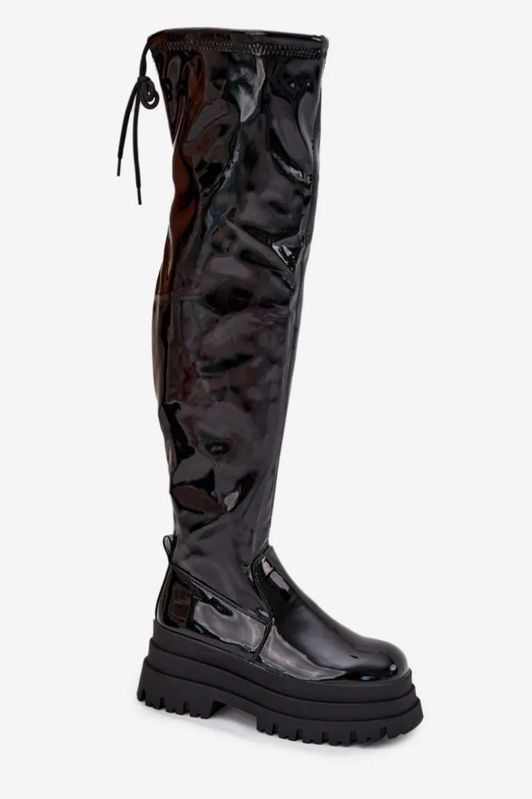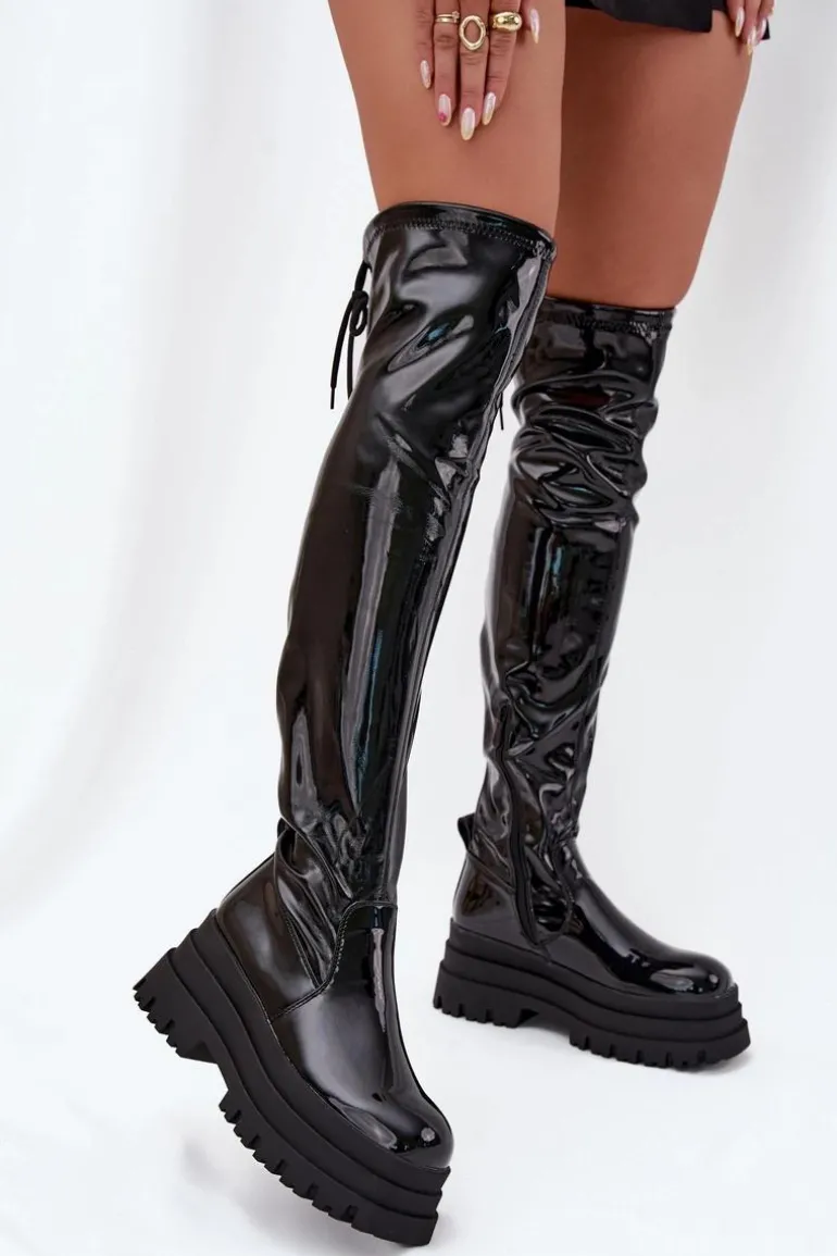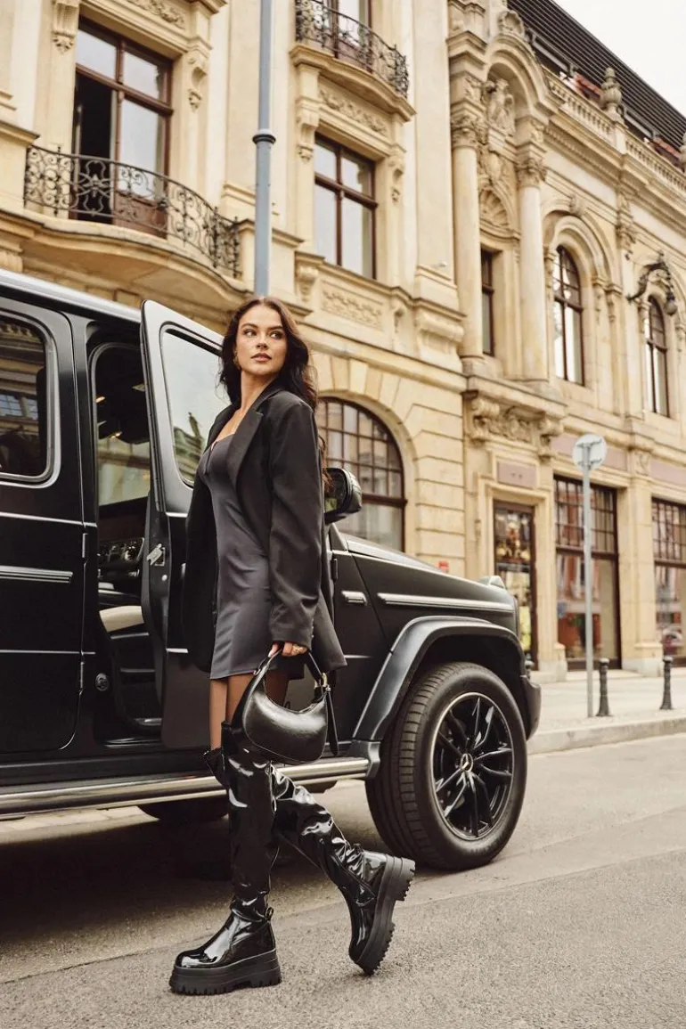 Kozaki damskie wykonane z lakierowanej eko skóry. Osadzone na masywnej platformie, zapewniają stabilność i wygodę. Zaokrąglone noski dodają subtelności, a model wsuwany z dodatkowym suwakiem na dole cholewki ułatwia zakładanie. Ściągacz na górze cholewki dodaje im charakteru, a ocieplenie kocem obuwniczym wyłącznie na poziomie stopy gwarantuje ciepło i komfort. Idealne na chłodniejsze dni, te kozaki doskonale sprawdzą się w zimowych stylizacjach z sukienkami i spódnicami. Przy wyborze rozmiaru prosimy sugerować się tabelą rozmiarów.