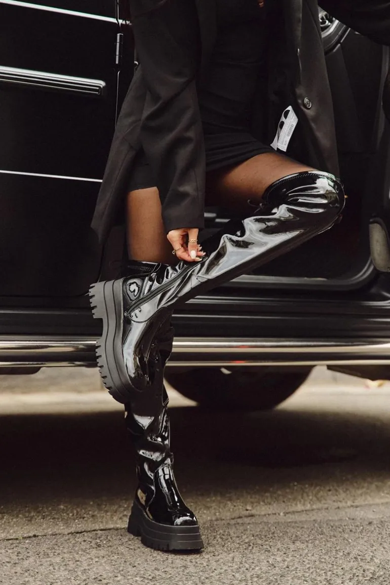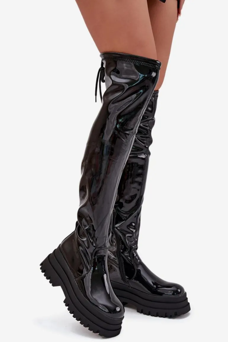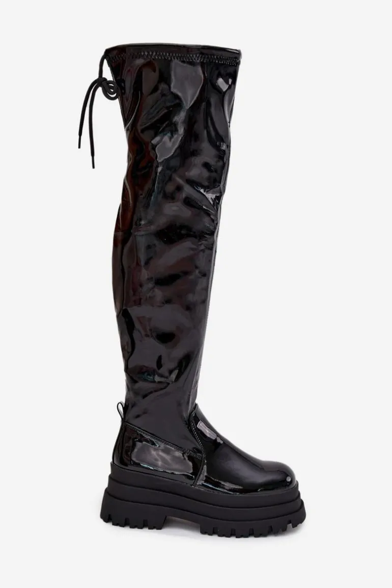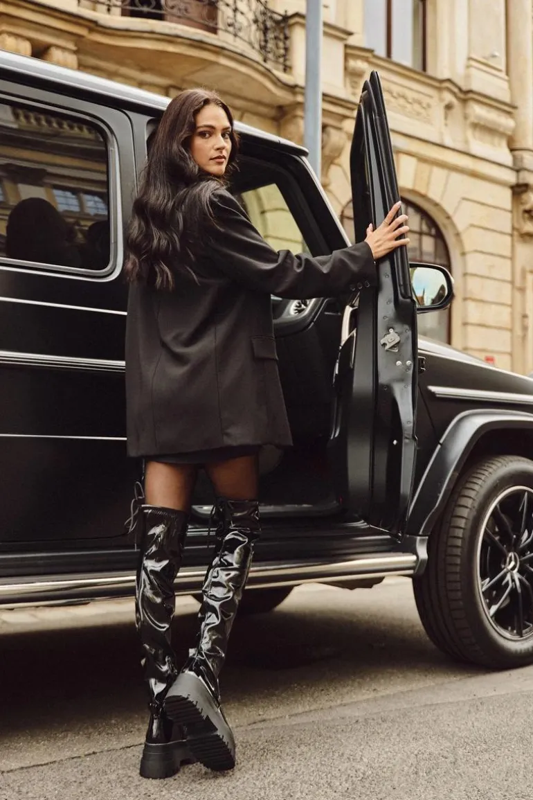 Kozaki damskie wykonane z lakierowanej eko skóry. Osadzone na masywnej platformie, zapewniają stabilność i wygodę. Zaokrąglone noski dodają subtelności, a model wsuwany z dodatkowym suwakiem na dole cholewki ułatwia zakładanie. Ściągacz na górze cholewki dodaje im charakteru, a ocieplenie kocem obuwniczym wyłącznie na poziomie stopy gwarantuje ciepło i komfort. Idealne na chłodniejsze dni, te kozaki doskonale sprawdzą się w zimowych stylizacjach z sukienkami i spódnicami. Przy wyborze rozmiaru prosimy sugerować się tabelą rozmiarów.