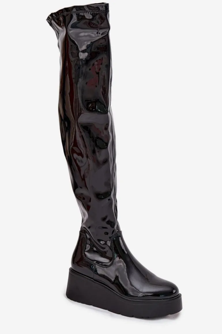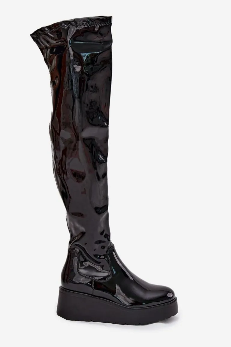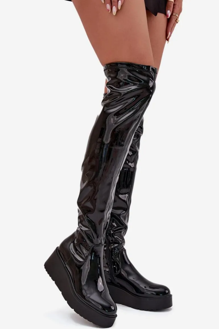 Kozaki damskie wykonane z lakierowanej eko skóry to elegancka propozycja na chłodniejsze dni. Osadzone na masywnej platformie i delikatnym koturnie, zapewniają stabilność i wygodę. Model wsuwany z dodatkowym suwakiem na dole cholewki ułatwia zakładanie i zdejmowanie butów. Zaokrąglone noski dodają im subtelnego charakteru, a ocieplenie kocem obuwniczym na poziomie stopy gwarantuje ciepło i komfort. Te kozaki to doskonałe uzupełnienie zimowych stylizacji, szczególnie w połączeniu z sukienkami i spódnicami. Przy wyborze rozmiaru prosimy sugerować się tabelą rozmiarów.