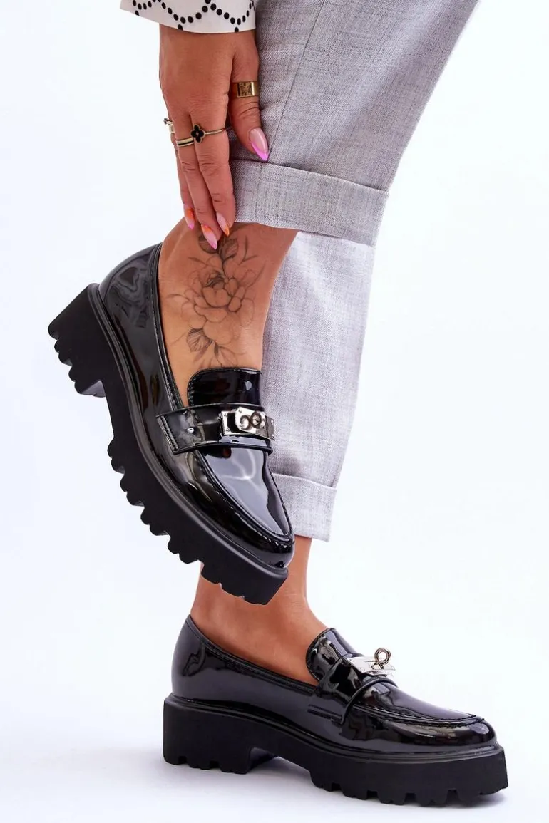 Mokasyny damskie zostały wykonane z eko skóry. Osadzono je na platformie i płaskim obcasie ze żłobieniami. Podeszwa została wykonana z tworzywa sztucznego. Miękka wkładka z eko skóry zapewni komfortowe użytkowanie. Mokasyny posiadają z przodu ozdobny element. Świetny model do wielu eleganckich i casualowych stylizacji. Przy wyborze rozmiaru prosimy sugerować się tabelą rozmiarów.