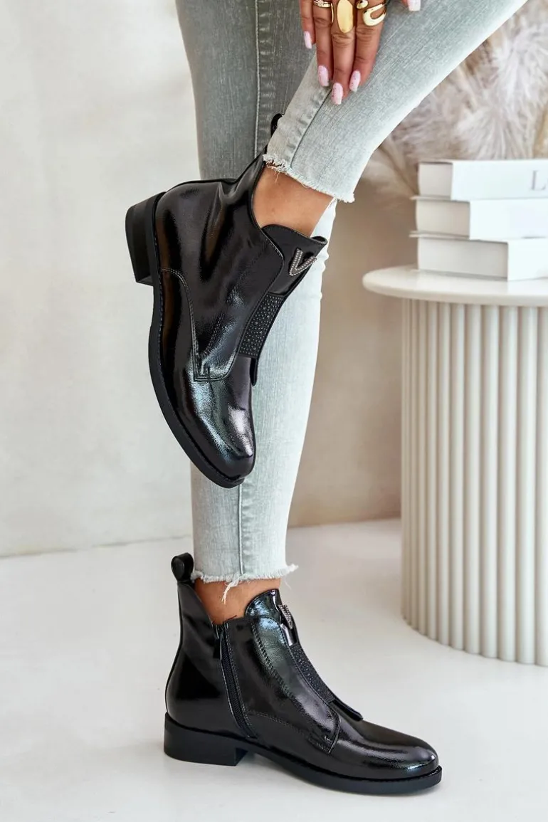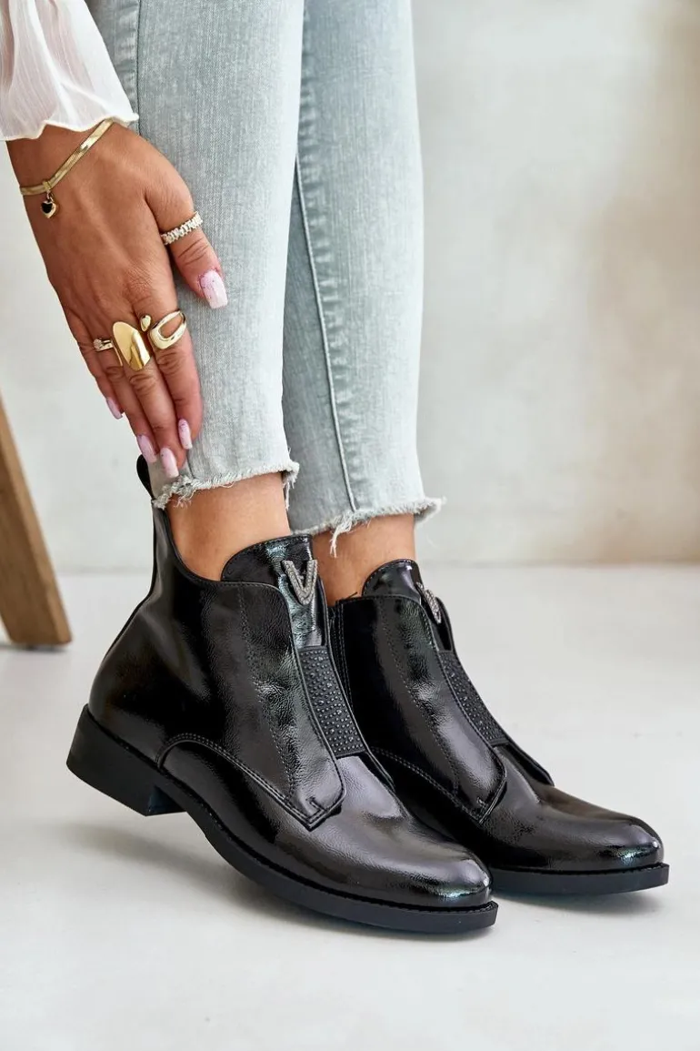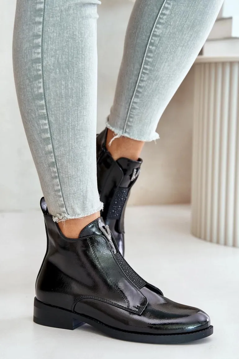 Botki damskie wykonane ze skóry ekologicznej. Osadzone na płaskim obcasie, który zapewni stabilność na każdym kroku. Środek ocieplony kocem obuwniczym. Noski zaokrąglone. Zapinane na zamek. Z przodu zdobiona, elastyczna wstawka oraz mały detal na języku. Cholewka za kostkę. Usztywniony zapiętek. Przy wyborze rozmiaru prosimy sugerować się tabelą rozmiarów.