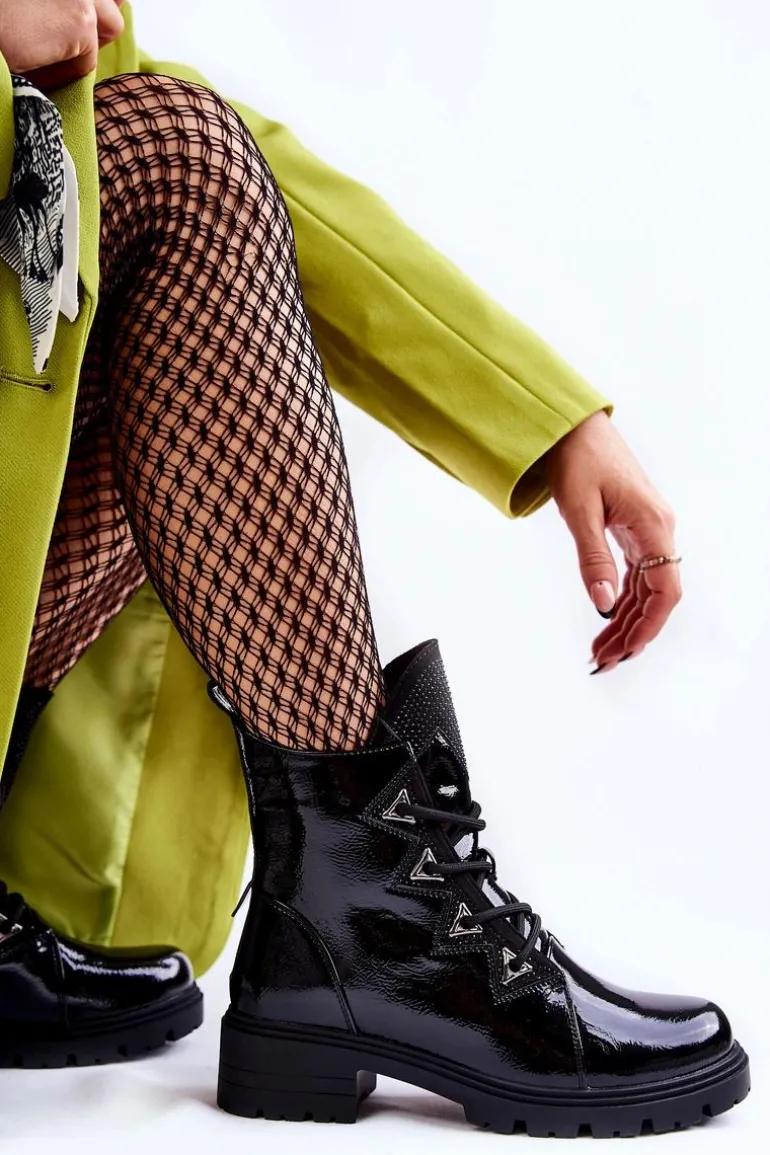 Botki damskie to idealny wybór na przejściowy sezon. Te botki zostały wykonane z lakierowanej eko skóry. Posiadają dżety przy sznurowadłach i na języku. Dodatkowo zapiętek jest usztywniany. Model ten posiada ocieplenie w postaci koca obuwniczego. Botki osadzone na płaskim obcasie i platformie ze żłobieniami. Ten model powinien być Twój! Przy wyborze rozmiaru prosimy sugerować się tabelą rozmiarów.
