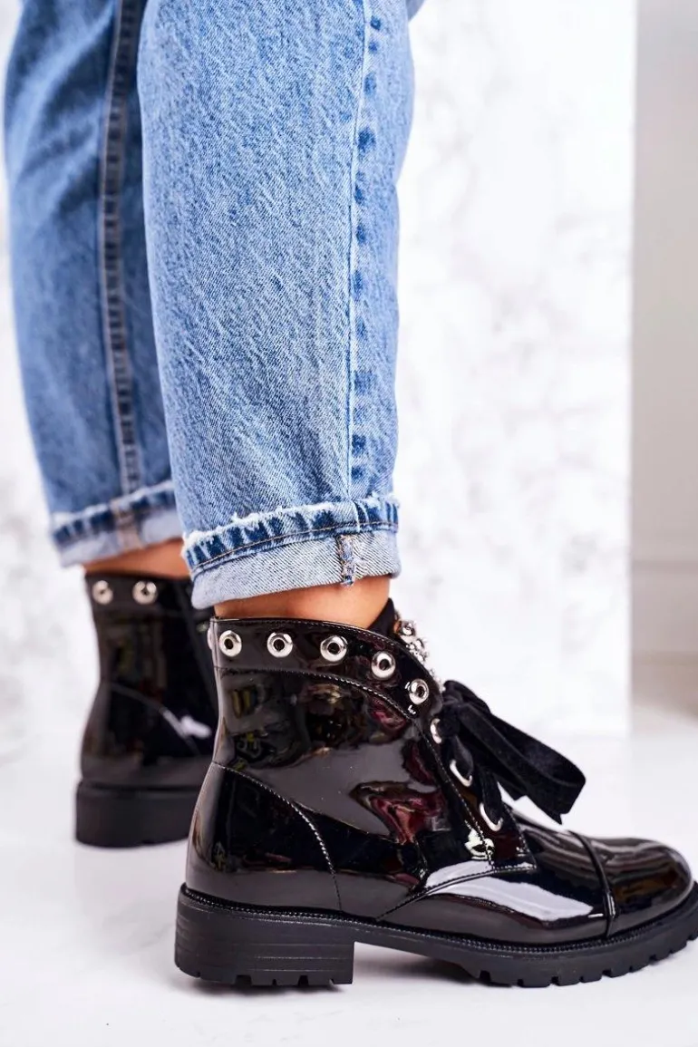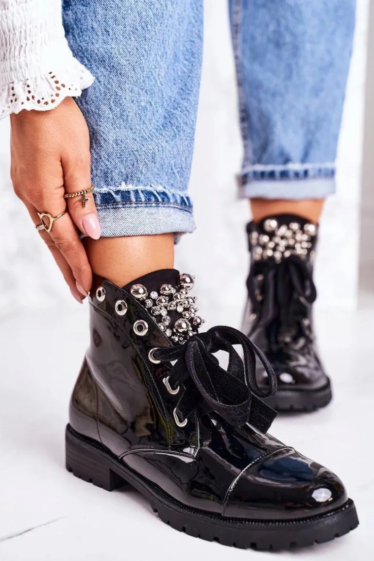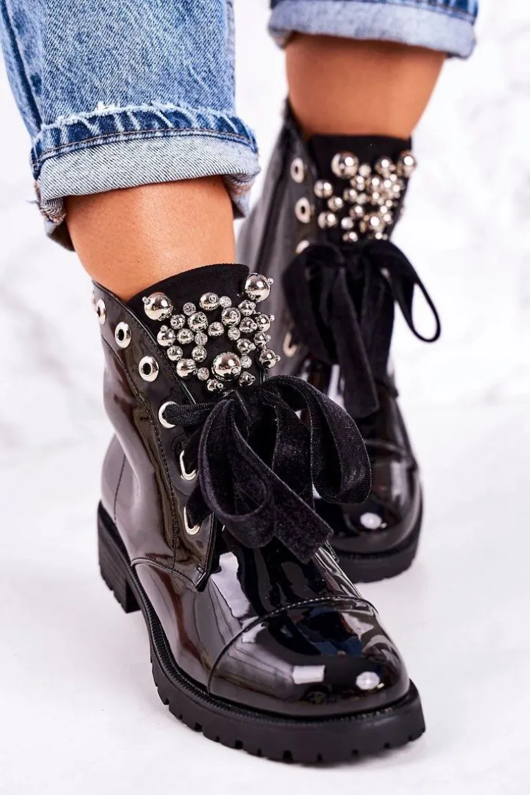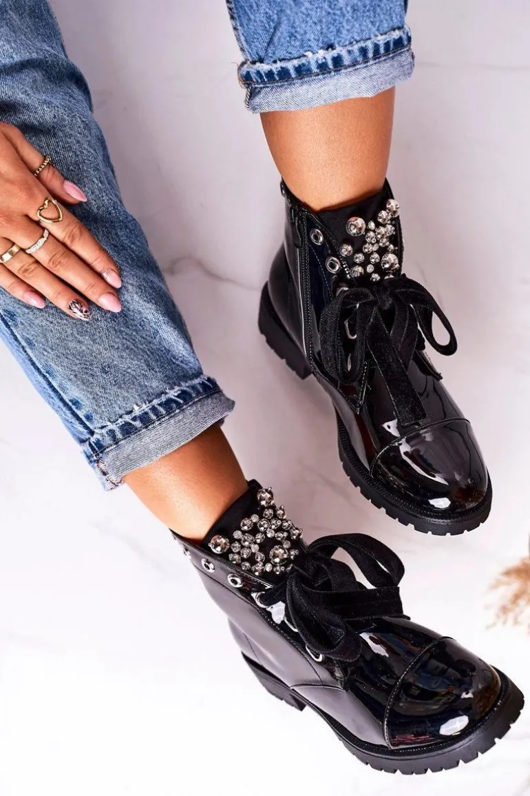 Wyjątkowe botki damskie wykonane z eko skóry. Wnętrze ocieplone jest miłym w dotyku kocem obuwniczym. Model wyróżnia się krojem cholewki oraz ozdobami. Przy wyborze rozmiaru prosimy sugerować się tabelą rozmiarów.