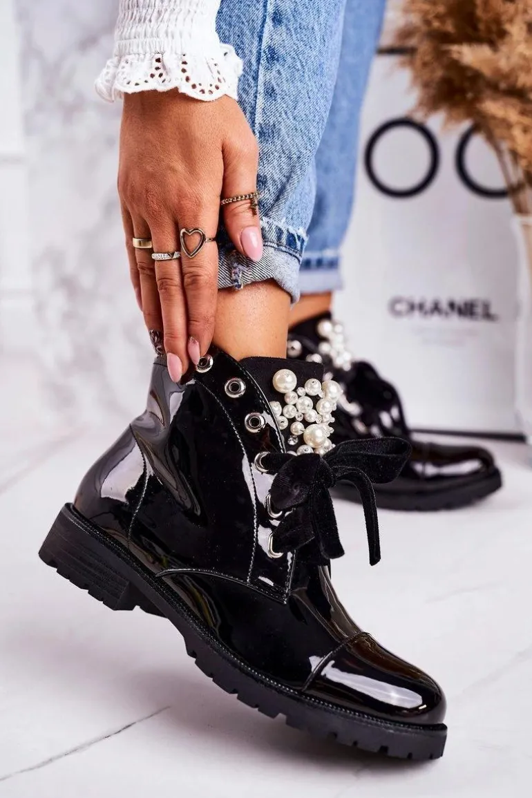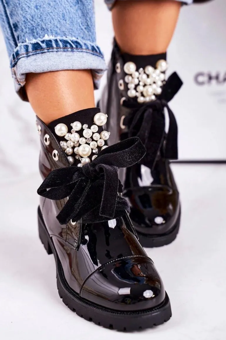Lakierowane Ocieplane Botki Z Perełkami I Wstążką Czarne Perla