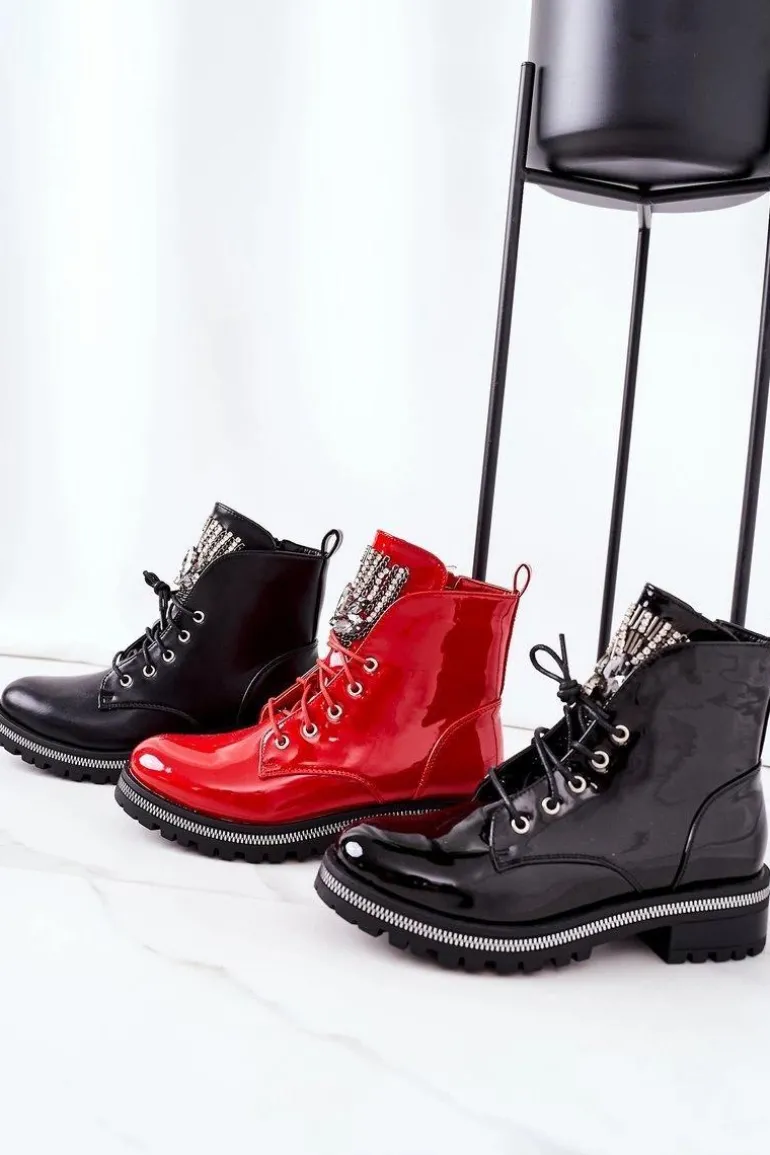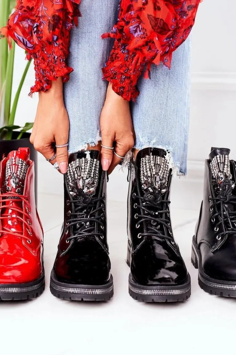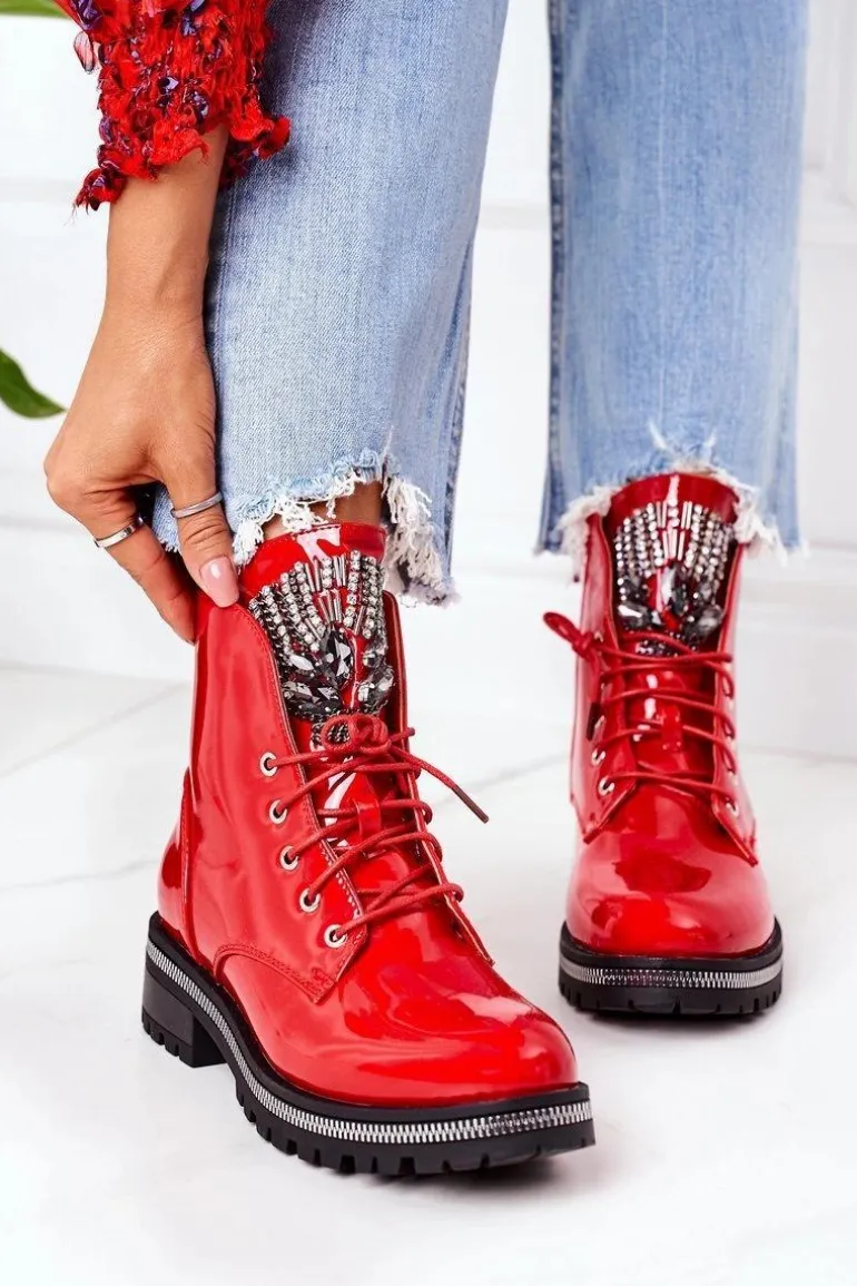 Wyjątkowe botki damskie wykonane z lakierowanej eko skóry. Workery są ocieplone miłym w dotyku kocem obuwniczym. Przy wyborze rozmiaru prosimy sugerować się tabelą rozmiarów.