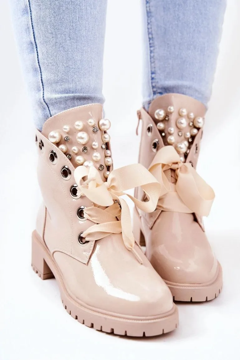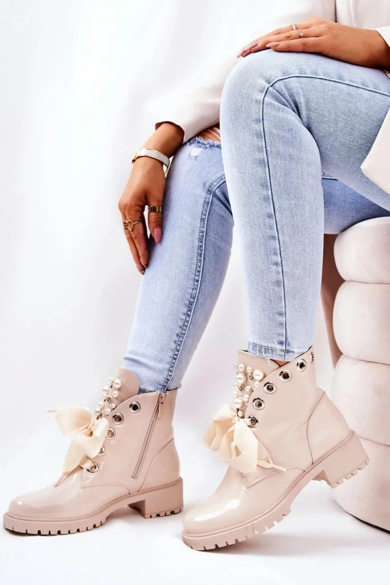 Wyjątkowe botki damskie wykonane z eko skóry. Wnętrze ocieplone jest miłym w dotyku kocem obuwniczym. Model wyróżnia się krojem cholewki oraz elementami w postaci perełek. Ozdobna wstążka świetnie dopełnia całość. Ten model musi być Twój! Nie czekaj dłużej aż zniknie! Przy wyborze rozmiaru prosimy sugerować się tabelą rozmiarów.
