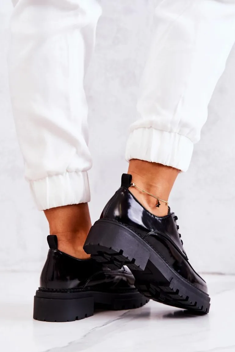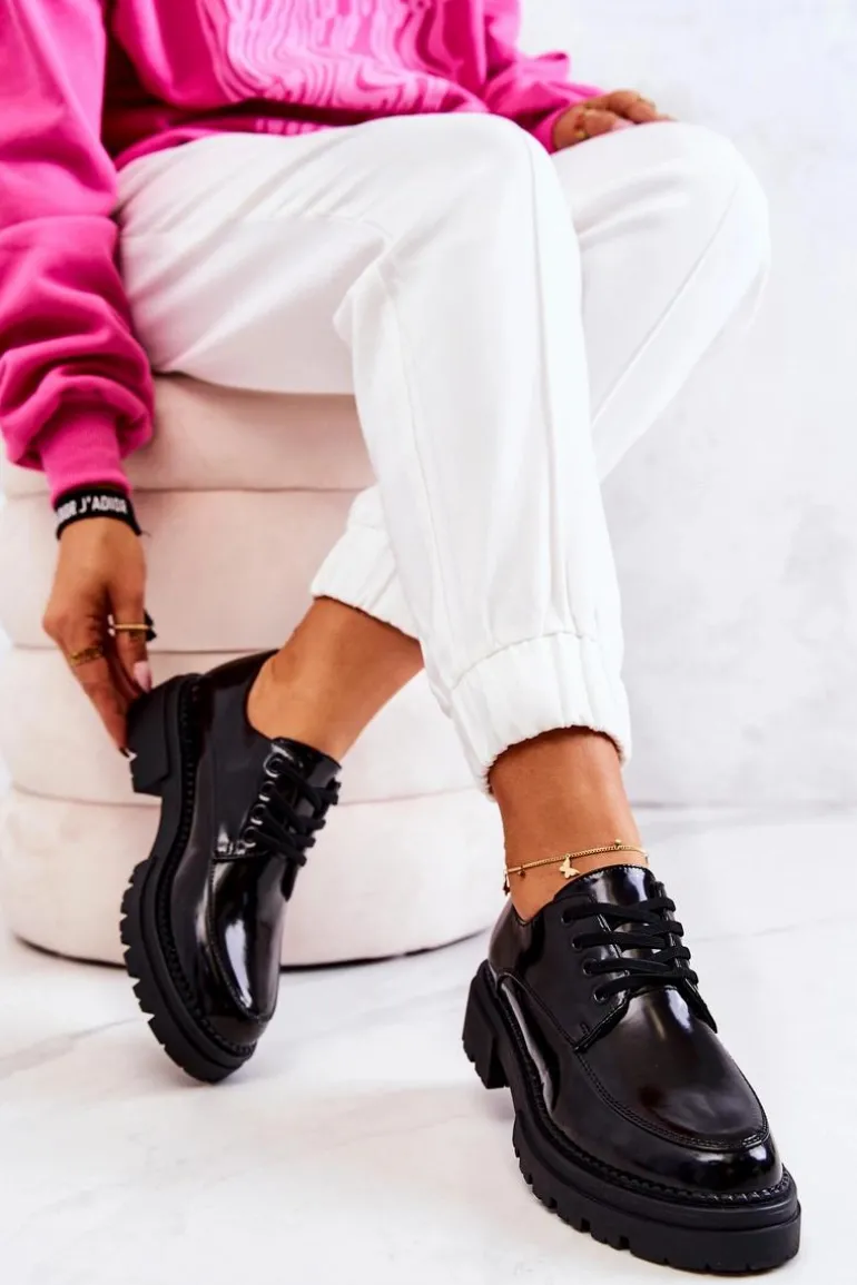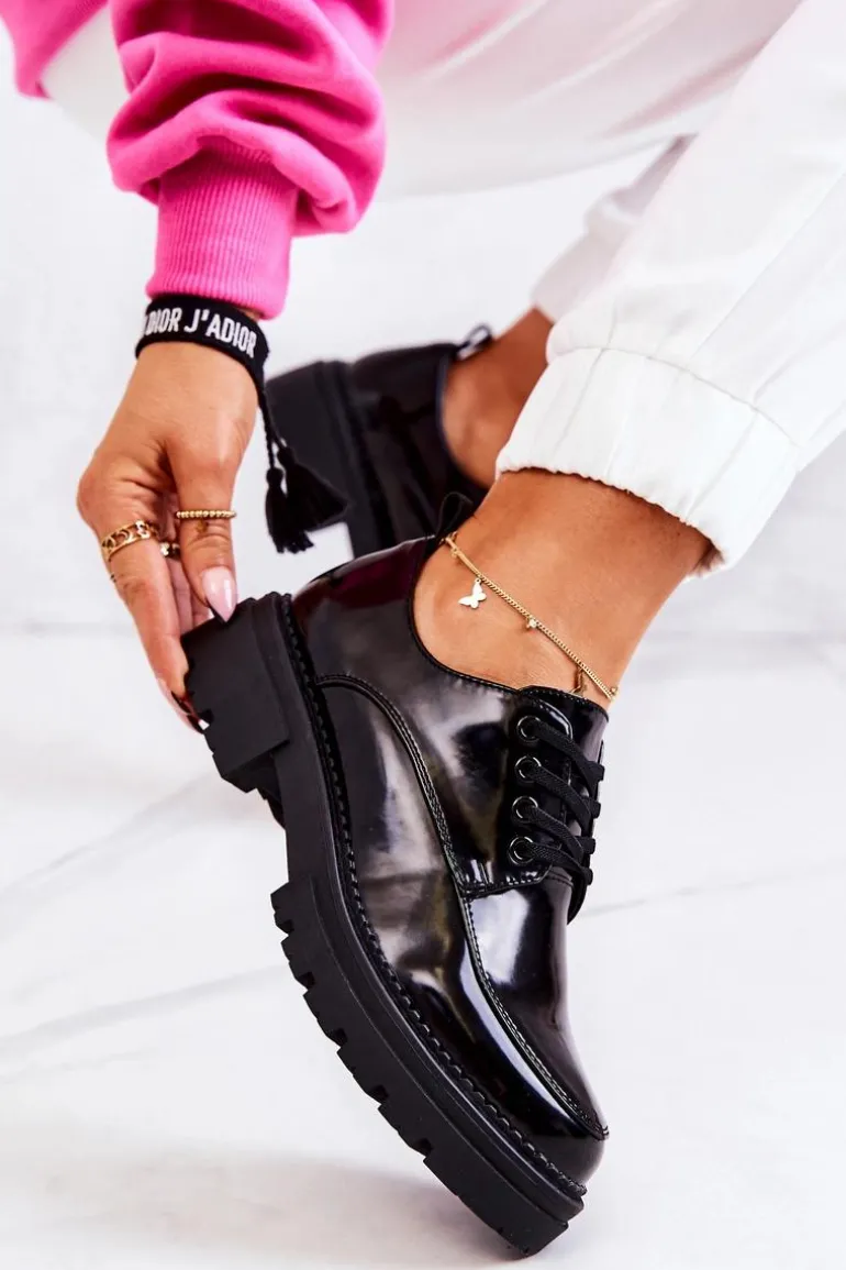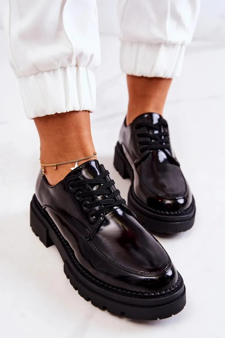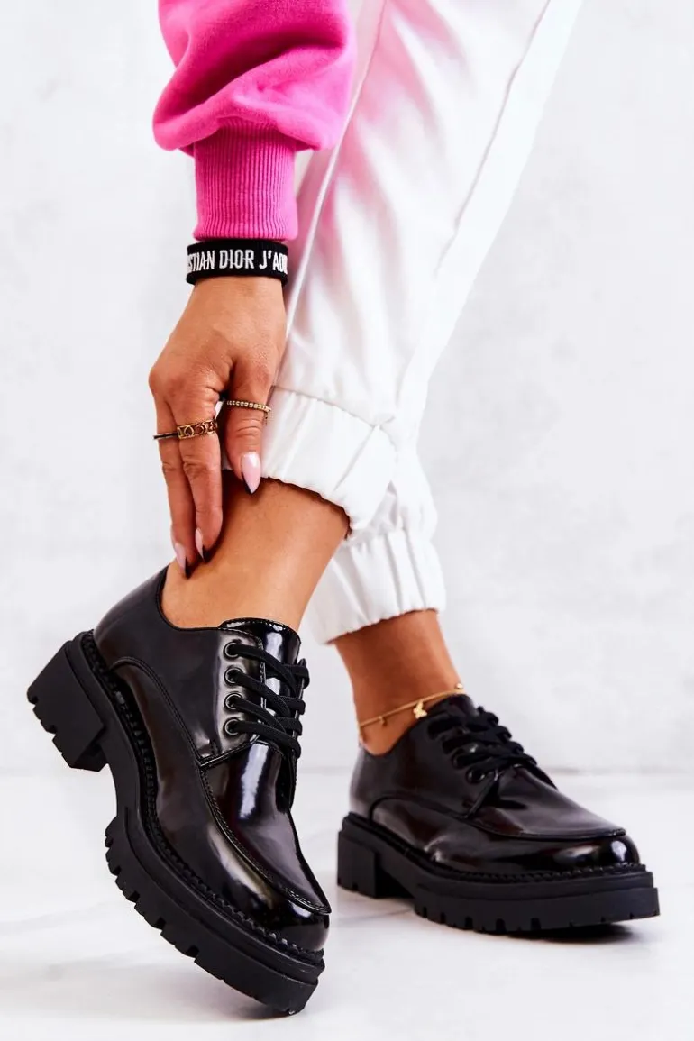 Półbuty zostały wykonane z wysokiej jakości lakierowanej eko skóry. Miękka wkładka ze skóry naturalnej to gwarancja komfortu. Elastyczne wiązanie sprawia, że można dopasować je odpowiednio do tęgości nogi. Niewysoki, masywny obcas zapewni wygodę. Koniecznie powinnaś mieć ten model w swojej szafie! Podczas wyboru rozmiaru prosimy sugerować się tabelą rozmiarów.
