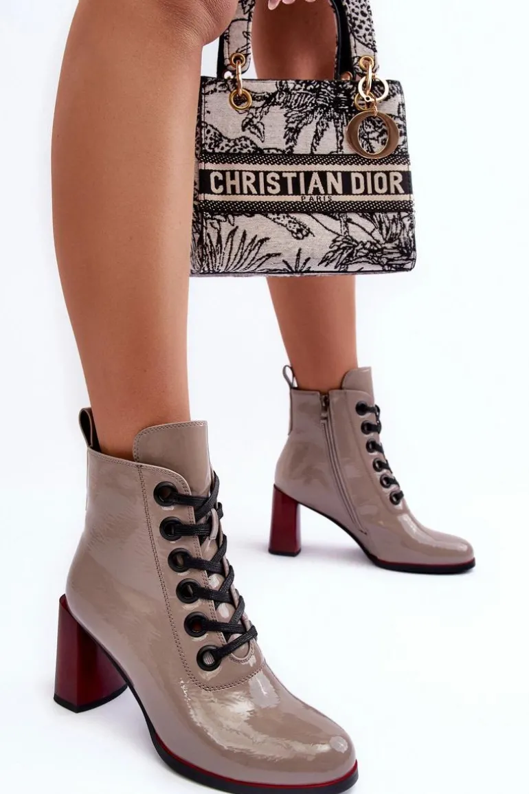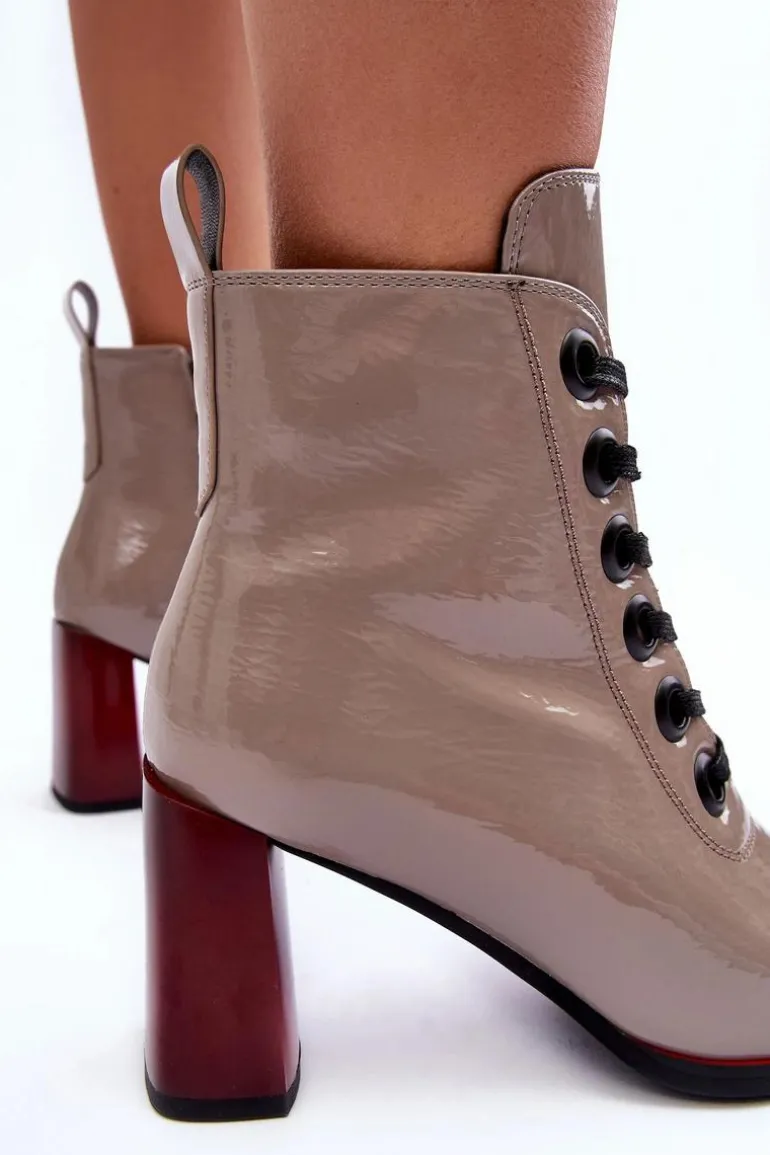 Botki marki S.Barski osadzone na obcasie w postaci słupka. Wykonane z eko skóry. Model zapinany na suwak po wewnętrznej stronie cholewki oraz dodatkowo posiada sznurowanie. Wnętrze ocieplone kocem obuwniczym. Zaokrąglone noski. Przy wyborze rozmiaru prosimy sugerować się tabelą rozmiarów.