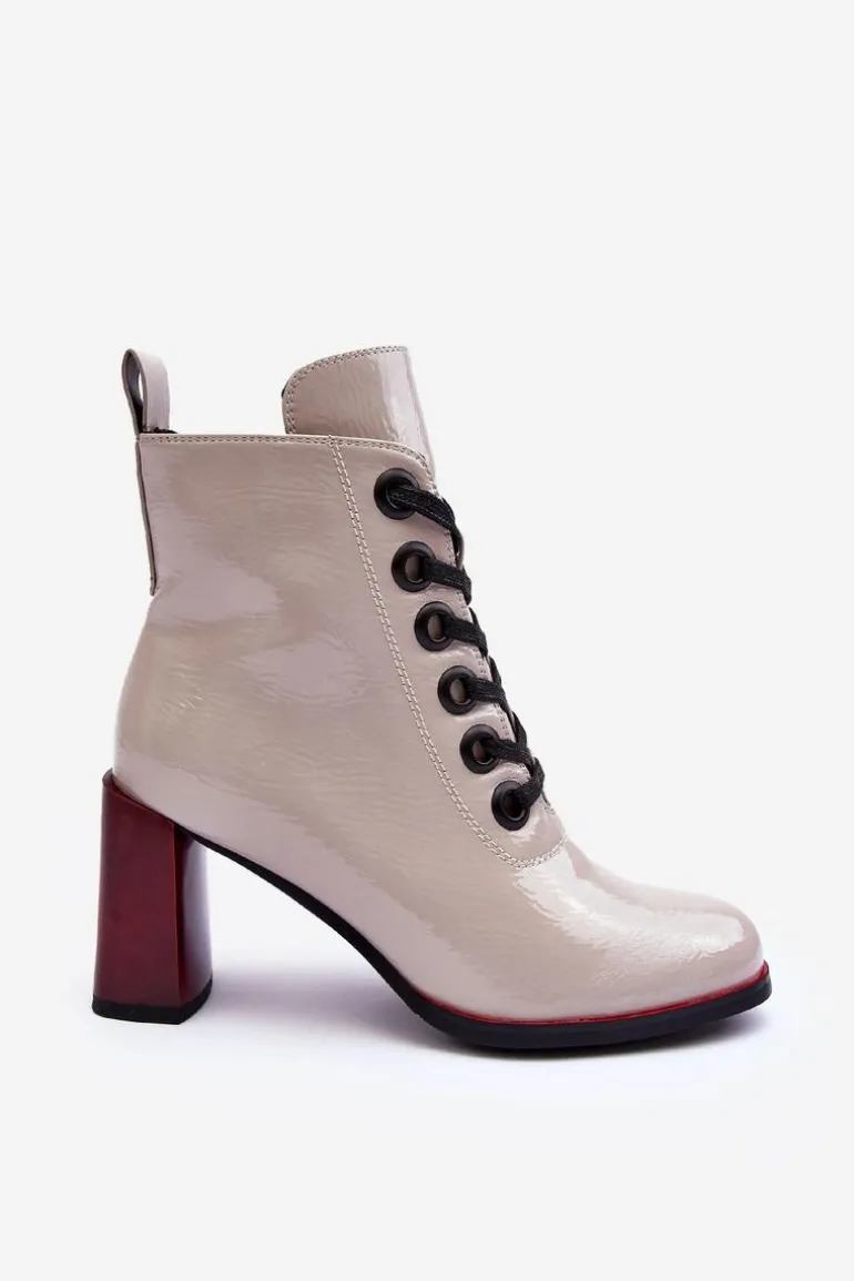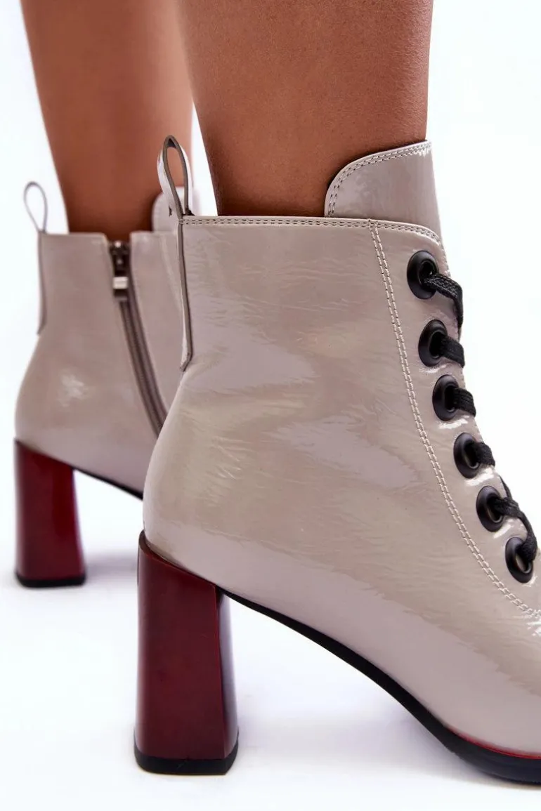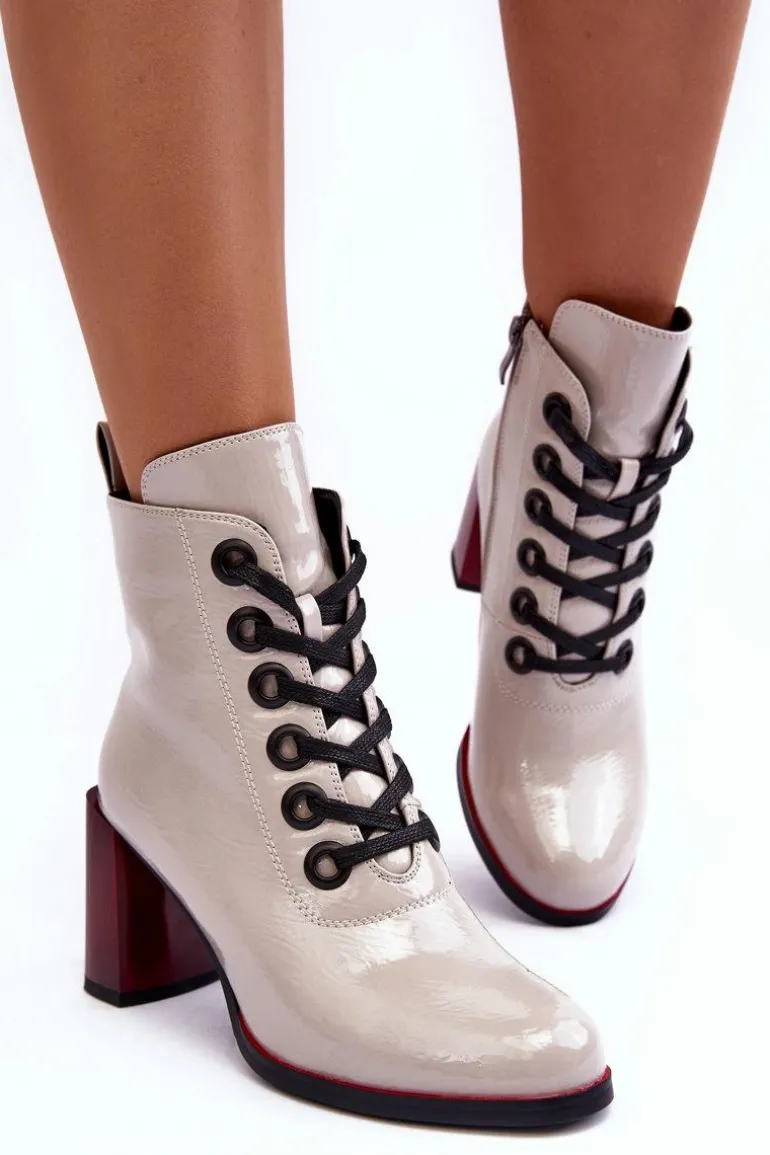 Botki marki S.Barski osadzone na obcasie w postaci słupka. Wykonane z eko skóry. Model zapinany na suwak po wewnętrznej stronie cholewki oraz dodatkowo posiada sznurowanie. Wnętrze ocieplone kocem obuwniczym. Zaokrąglone noski. Przy wyborze rozmiaru prosimy sugerować się tabelą rozmiarów.