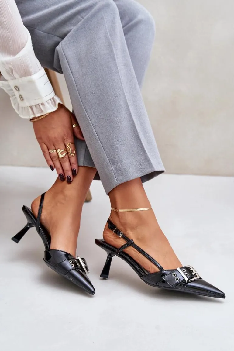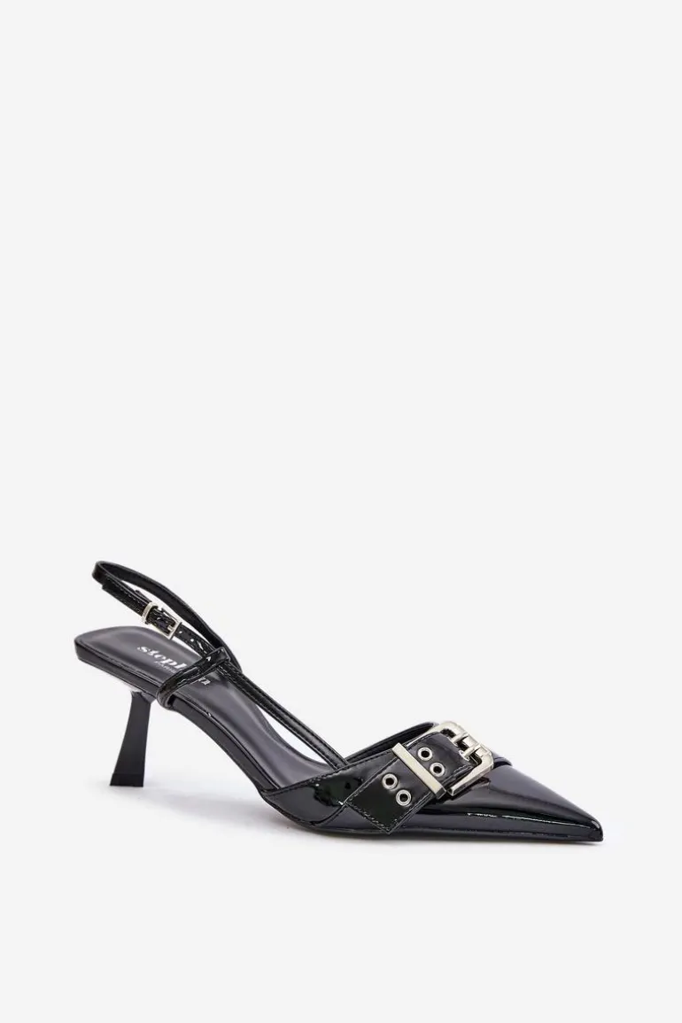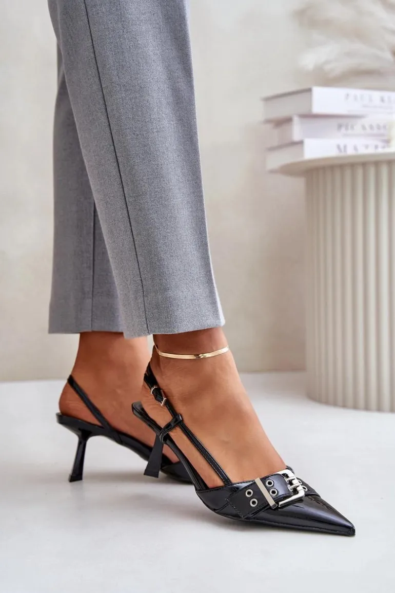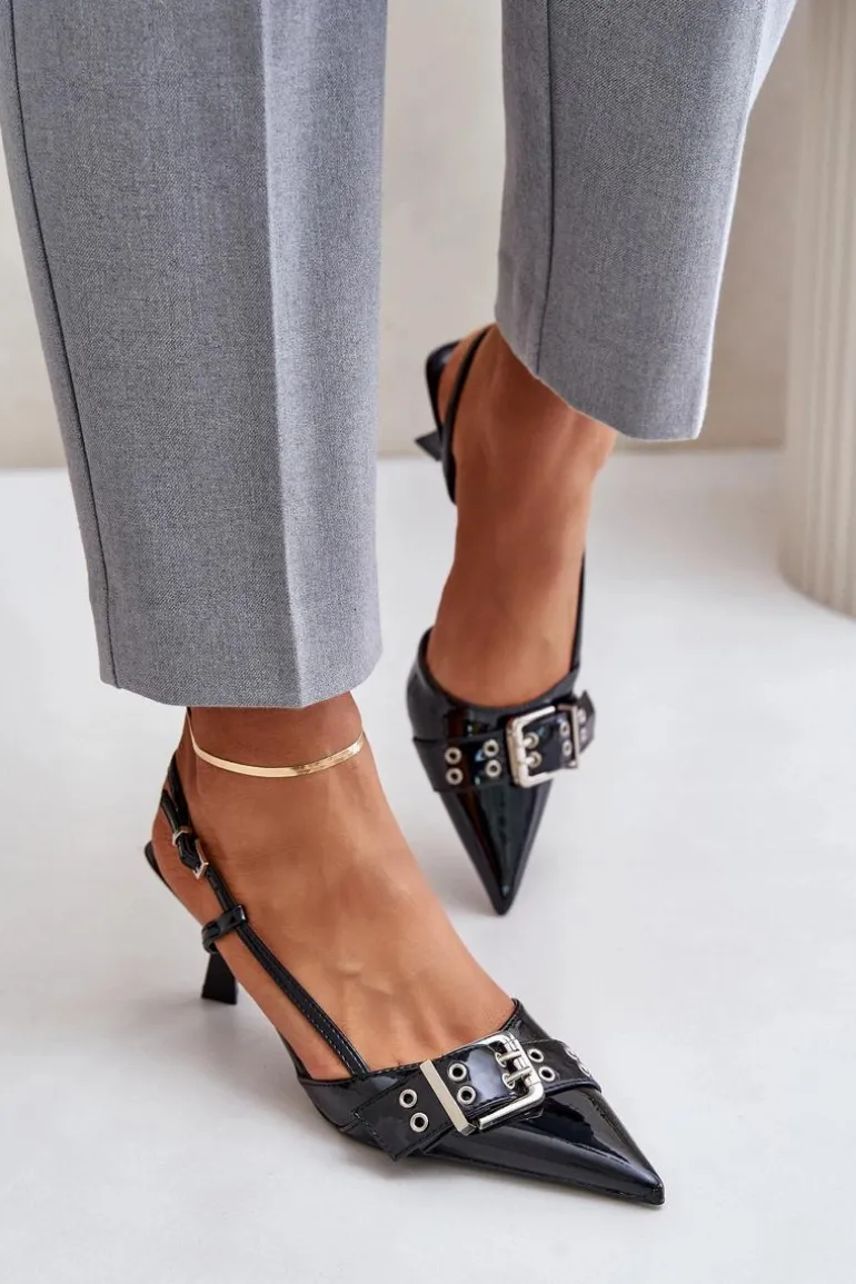 Lakierowane damskie szpilki wykonane z eko skóry to elegancka propozycja na specjalne okazje. Model charakteryzuje się spiczastymi noskami oraz regulowanym paskiem zapinanym na sprzączkę, co zapewnia idealne dopasowanie. Dodatkowym elementem ozdobnym jest stylowa klamra z przodu, która dodaje wyrazistości. Idealne do eleganckich sukienek i formalnych stylizacji. Przy wyborze rozmiaru prosimy sugerować się tabelą rozmiarów.