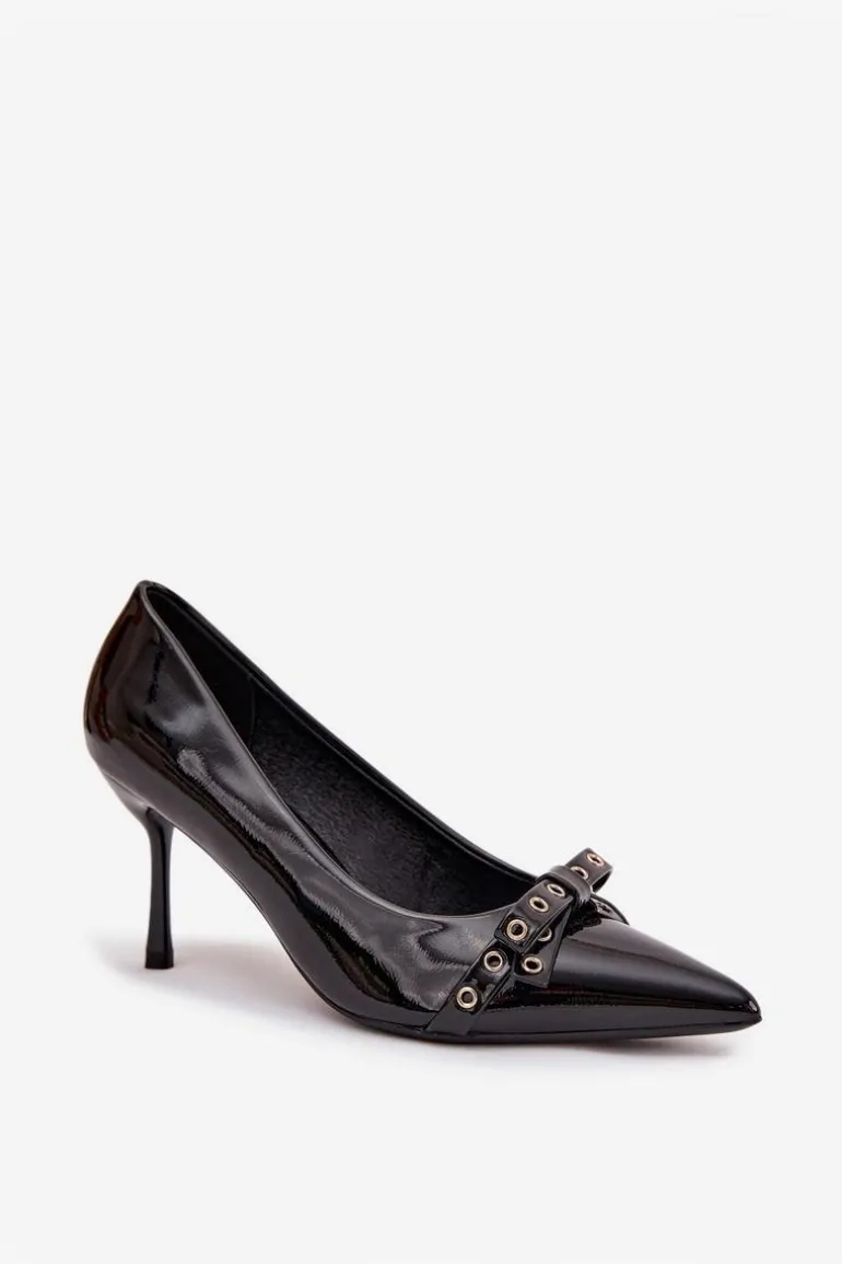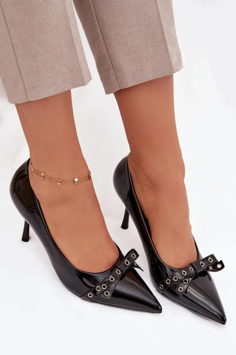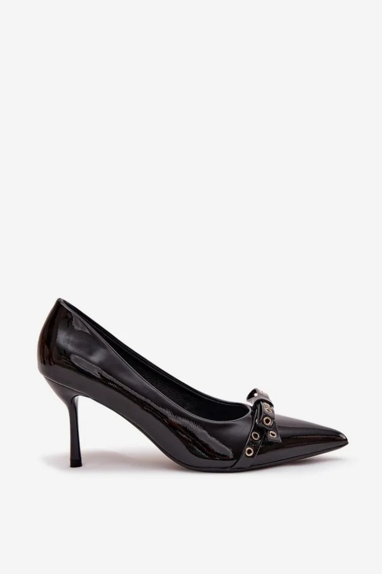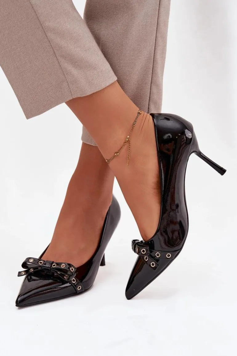 Klasyczne i pełne uroku szpilki wykonane z lakierowanej eko skóry to propozycja dla kobiet, które cenią elegancję i ponadczasowy styl. Błyszczące wykończenie dodaje im szyku, a szpiczasty nosek pięknie wysmukla nogi i podkreśla kobiecą sylwetkę. Na przodzie znajduje się ozdoba w formie delikatnej kokardki, która nadaje butom subtelnego, romantycznego charakteru. Smukła szpilka dodaje lekkości i elegancji, a jednocześnie zapewnia wyjątkowy wygląd przy każdej okazji. Te szpilki doskonale sprawdzą się zarówno do wieczorowych kreacji, jak i eleganckich stylizacji biurowych – zawsze wtedy, gdy chcesz wyglądać stylowo i czuć się wyjątkowo.