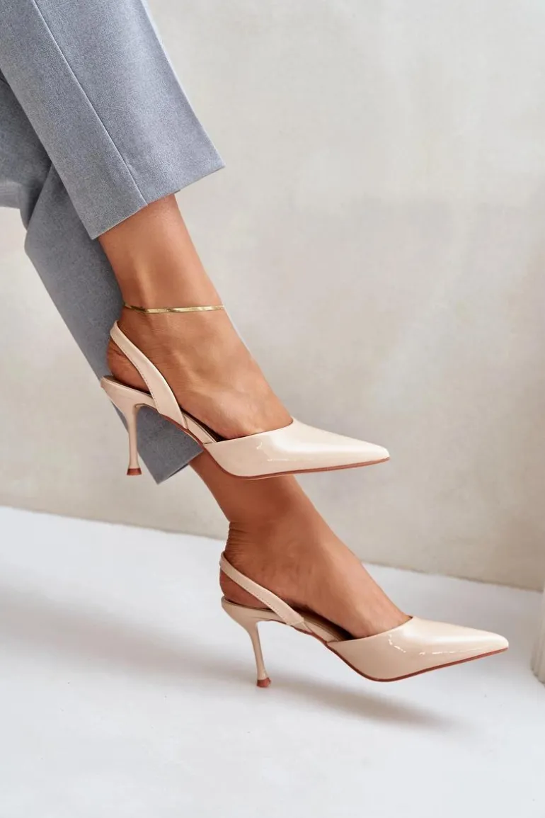 Szpilki z eko skóry to idealny wybór na specjalne okazje i wieczorne wyjścia. Klasyczne noski w szpic nadają im wyrafinowanego charakteru, optycznie wydłużając nogi. Z tyłu buta znajduje się pasek z gumką, który zapewnia lepsze dopasowanie do stopy, gwarantując komfort noszenia. Idealne do eleganckich sukienek oraz stylowych garniturów, te szpilki łączą w sobie szyk i wygodę. Przy wyborze rozmiaru prosimy sugerować się tabelą rozmiarów.