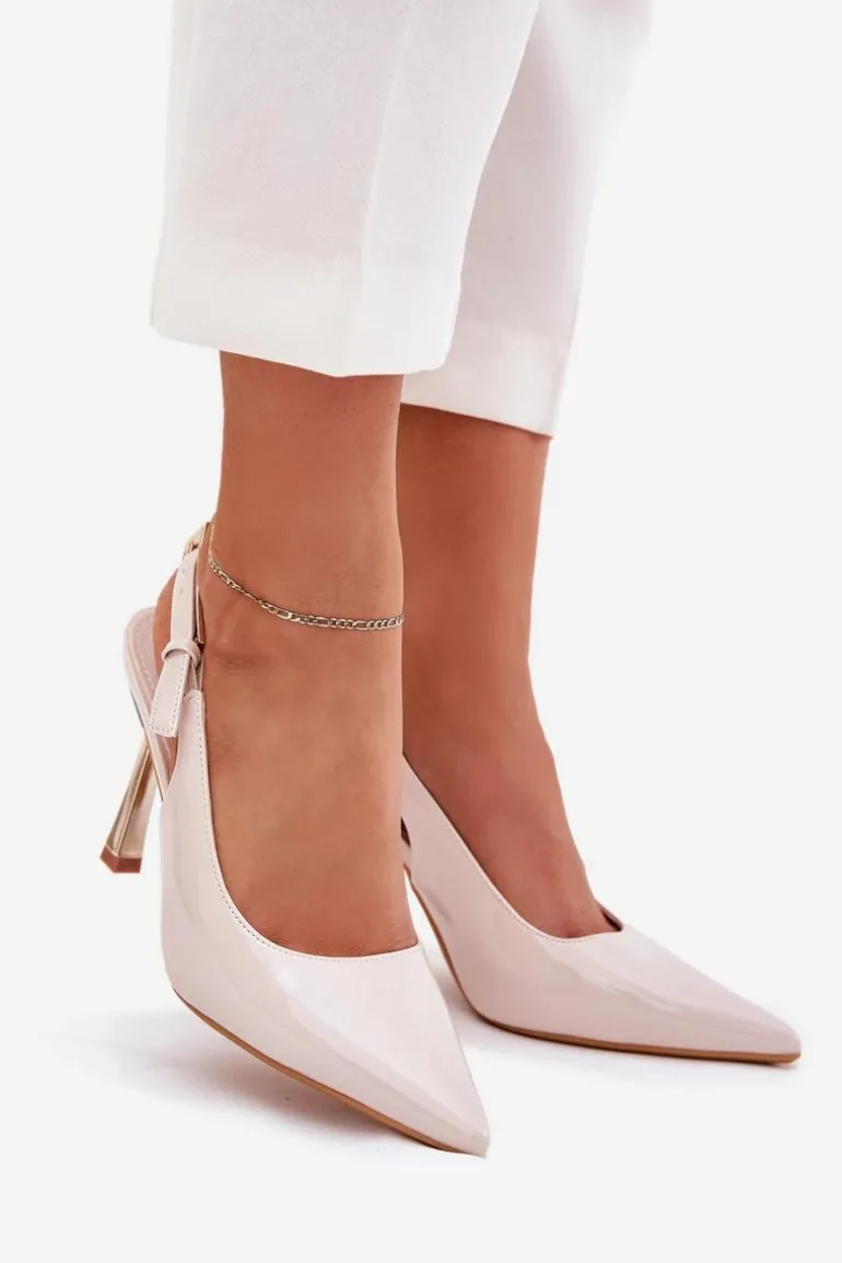 Lakierowane eleganckie szpilki z odkrytą piętą to połączenie klasyki i nowoczesności. Szpiczaste noski optycznie wysmuklają nogi, a zapinane na regulowany pasek ze sprzączką, zapewniają idealne dopasowanie i stabilność. Te szpilki doskonale sprawdzą się na specjalne okazje, łącząc elegancję z subtelnym, ale wyrazistym stylem. Idealne do wieczorowych stylizacji, dodają szyku i pewności siebie. Przy wyborze rozmiaru prosimy sugerować się tabelą rozmiarów.