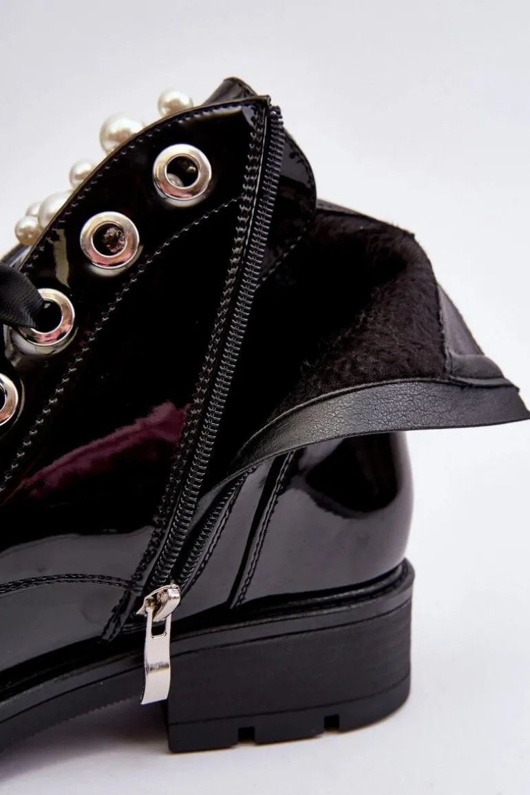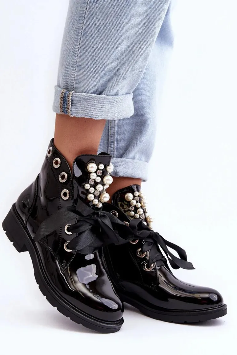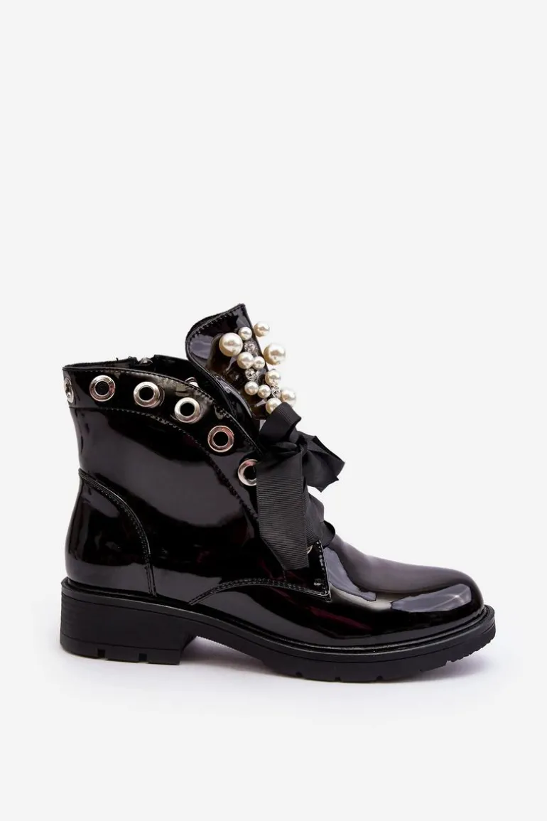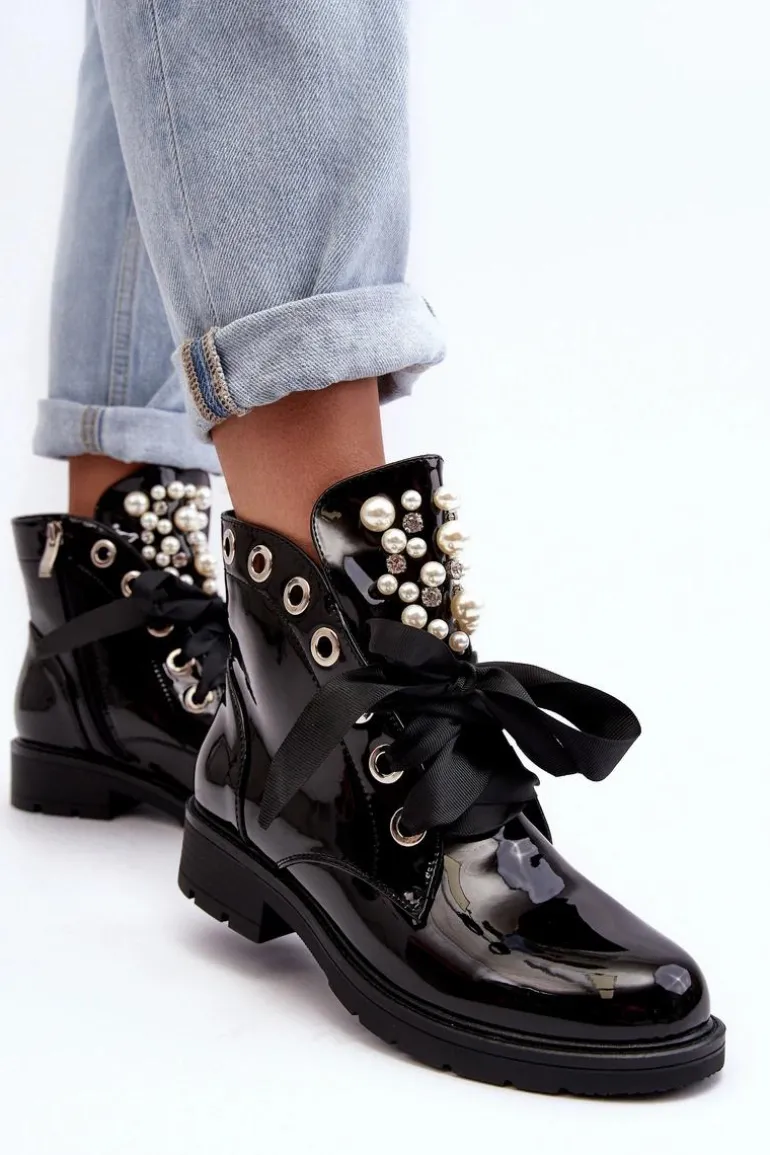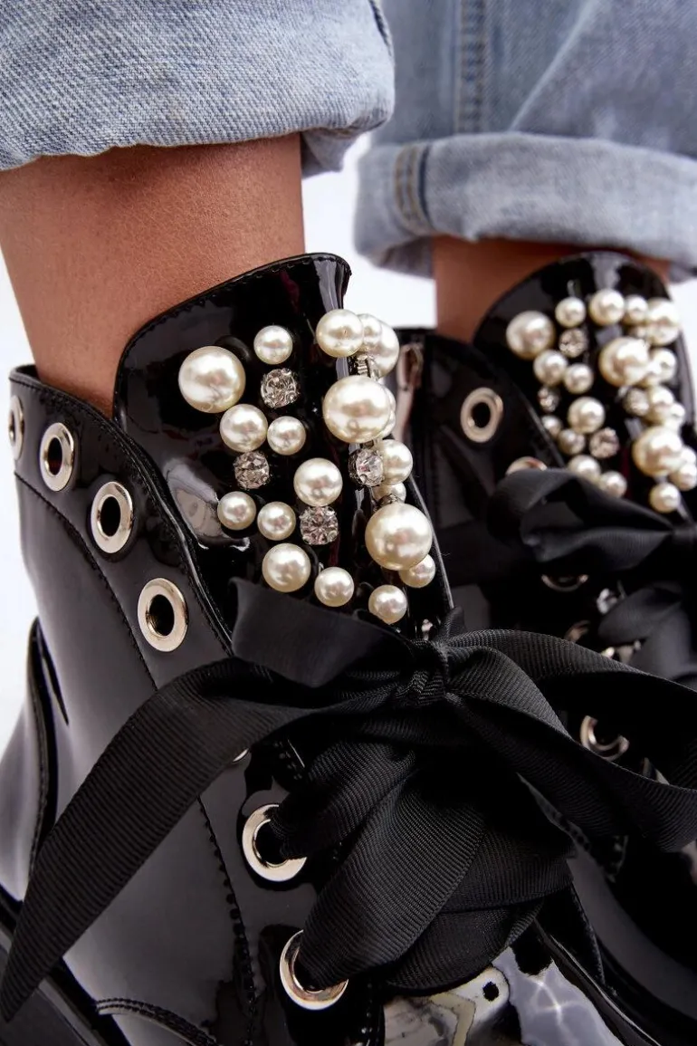 Modne damskie botki na płaskim, stabilnym obcasie. Wykonane z eko skóry. Model ten zapinany jest na suwak po wewnętrznej stronie cholewki oraz dodatkowo posiada sznurówki. Z przodu zdobienie w postaci sztucznych pereł oraz dżetów. Wnętrze ocieplone kocem obuwniczym. Zapiętek jest usztywniony. Świetnie sprawdzą się do wielu stylizacji! Przy wyborze rozmiaru prosimy sugerować się tabelą rozmiarów.