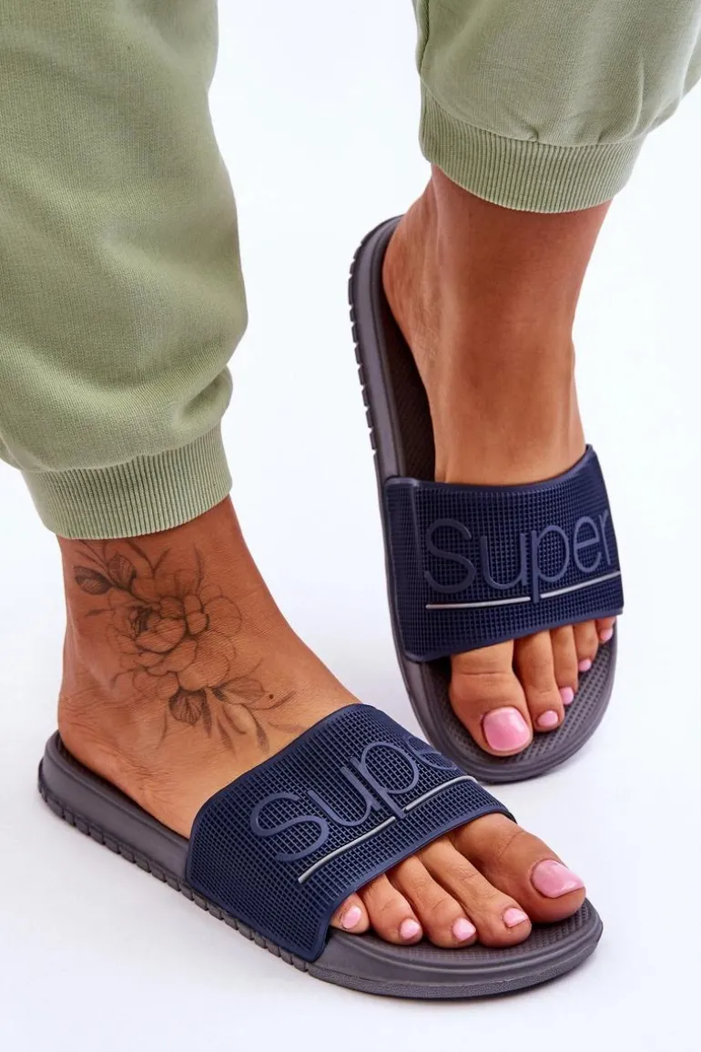 Lekkie Damskie Klapki Z Napisem Granatowo-Szare Merry