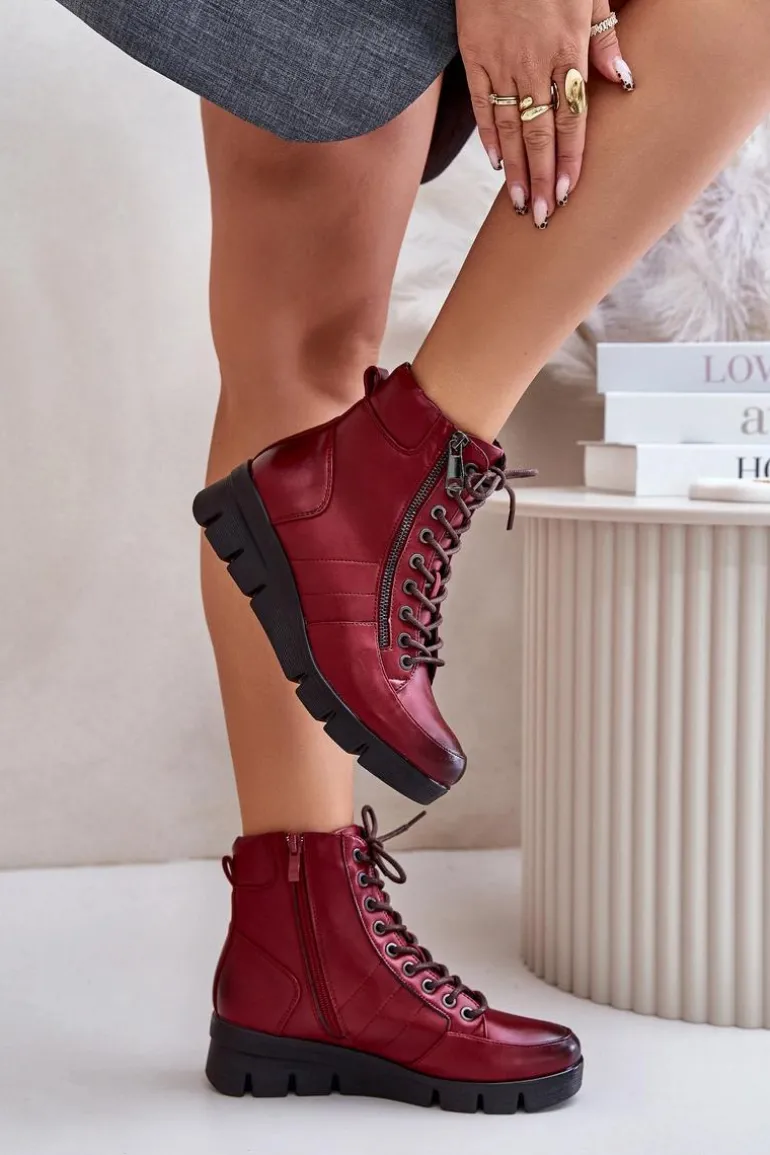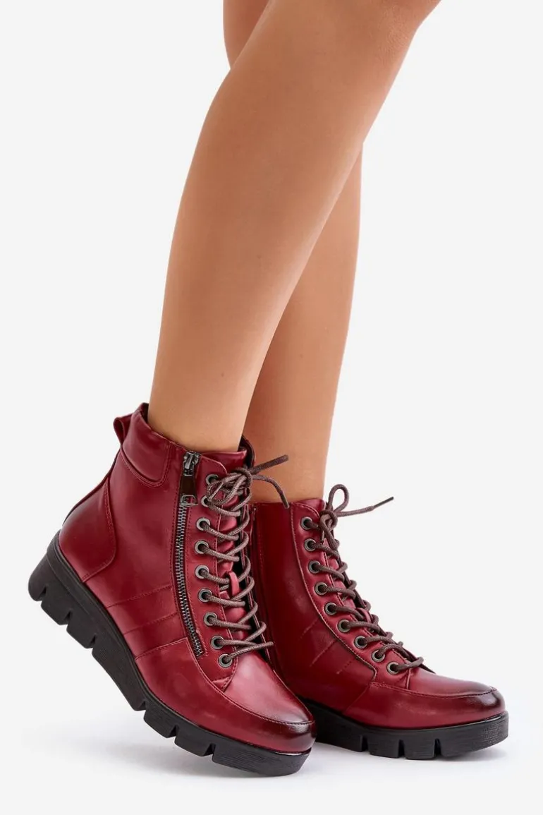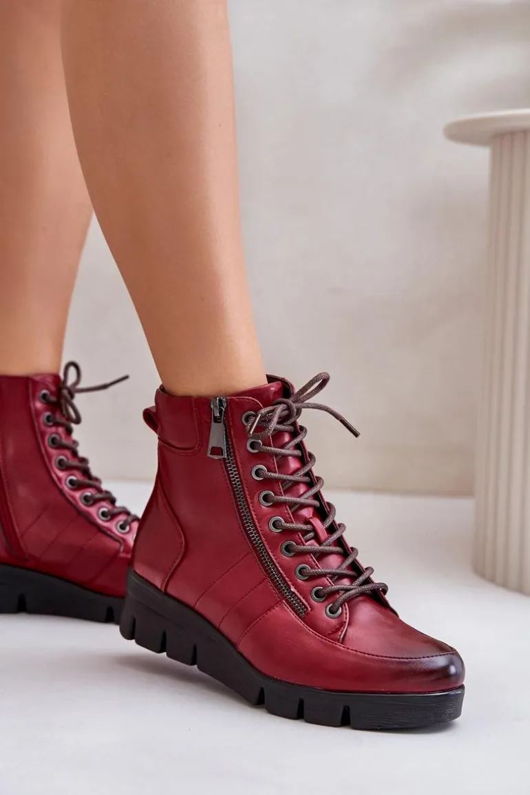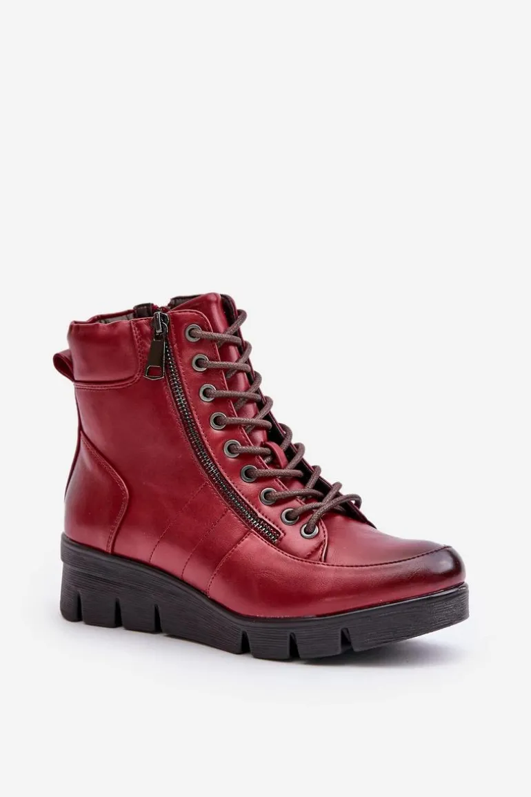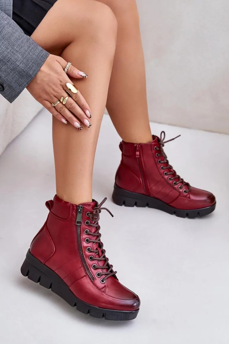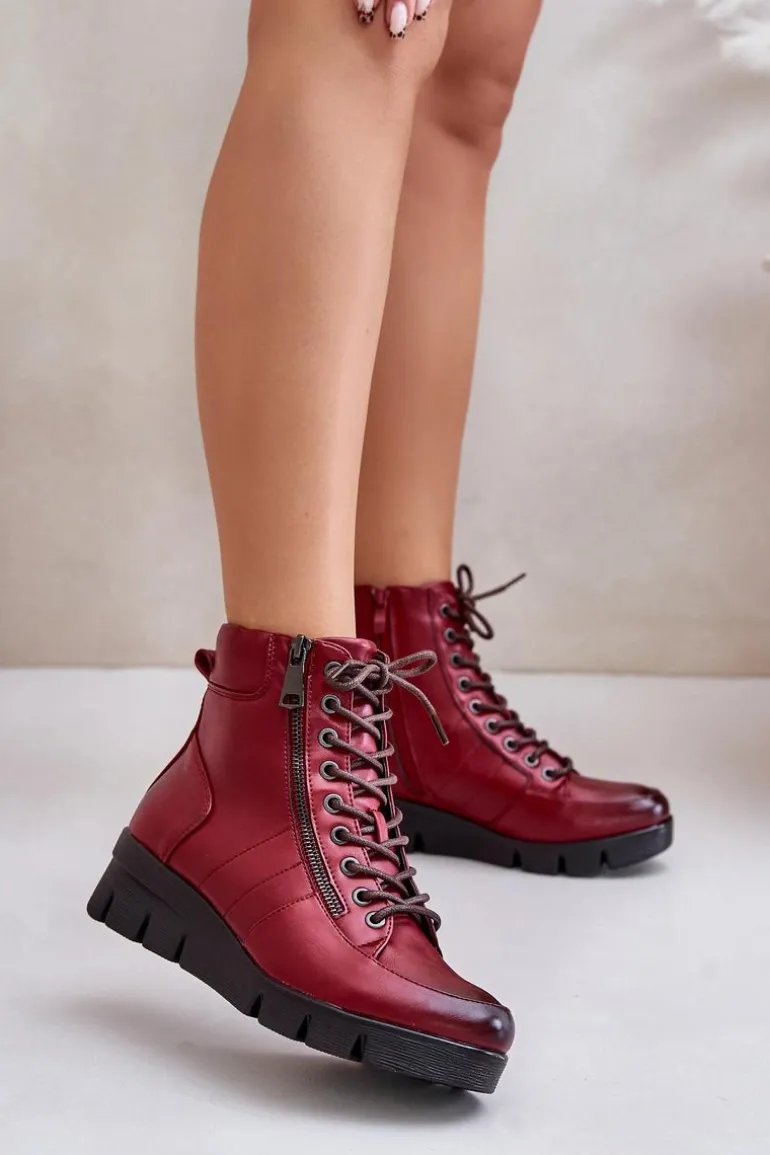 Lekkie Ocieplane Botki Damskie Na Platformie I Koturnie Bordowe Savindria