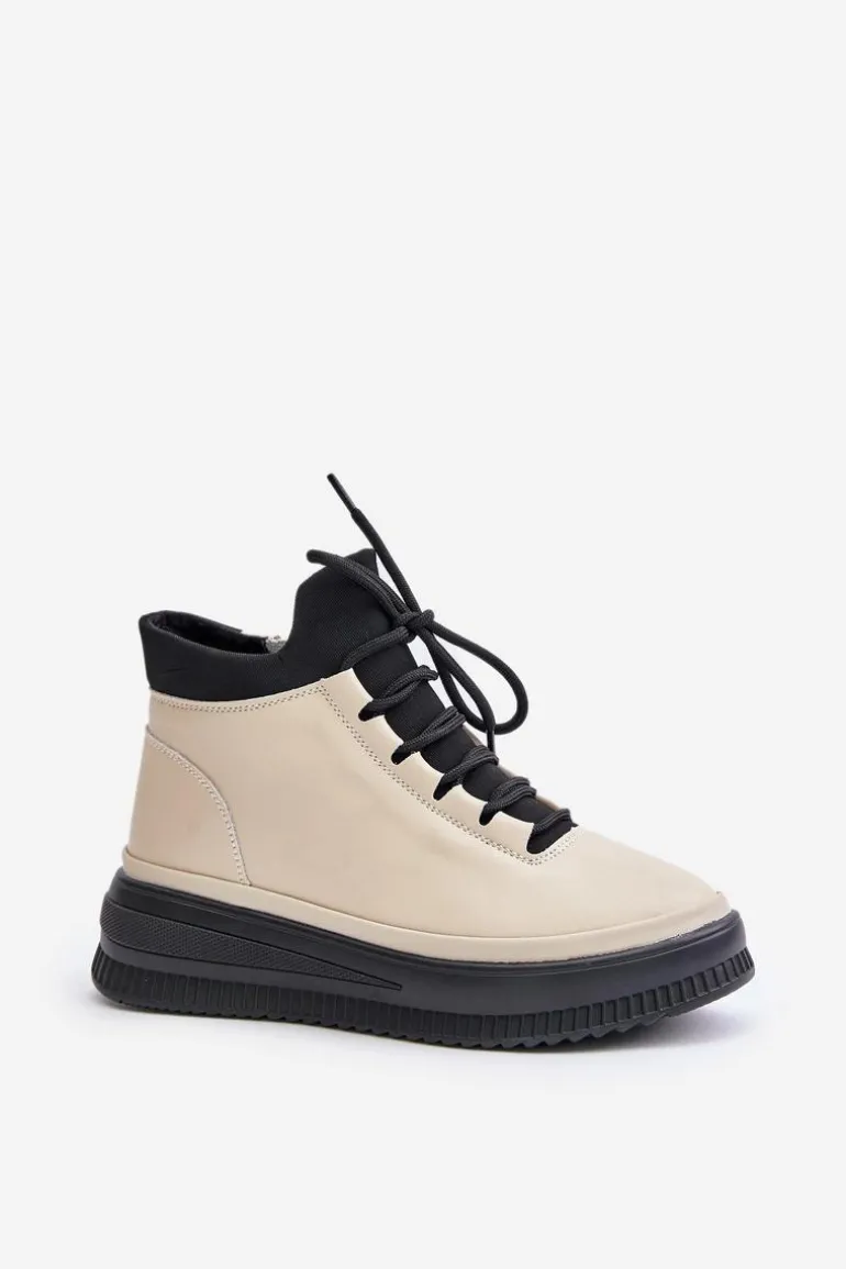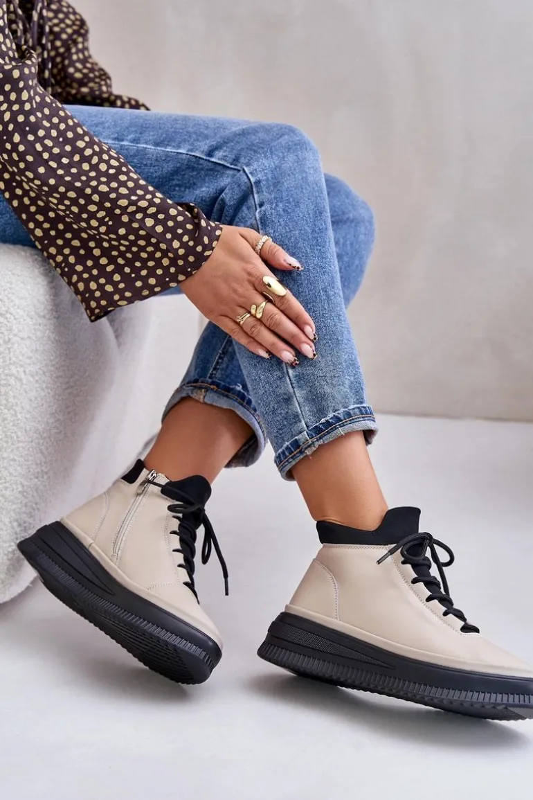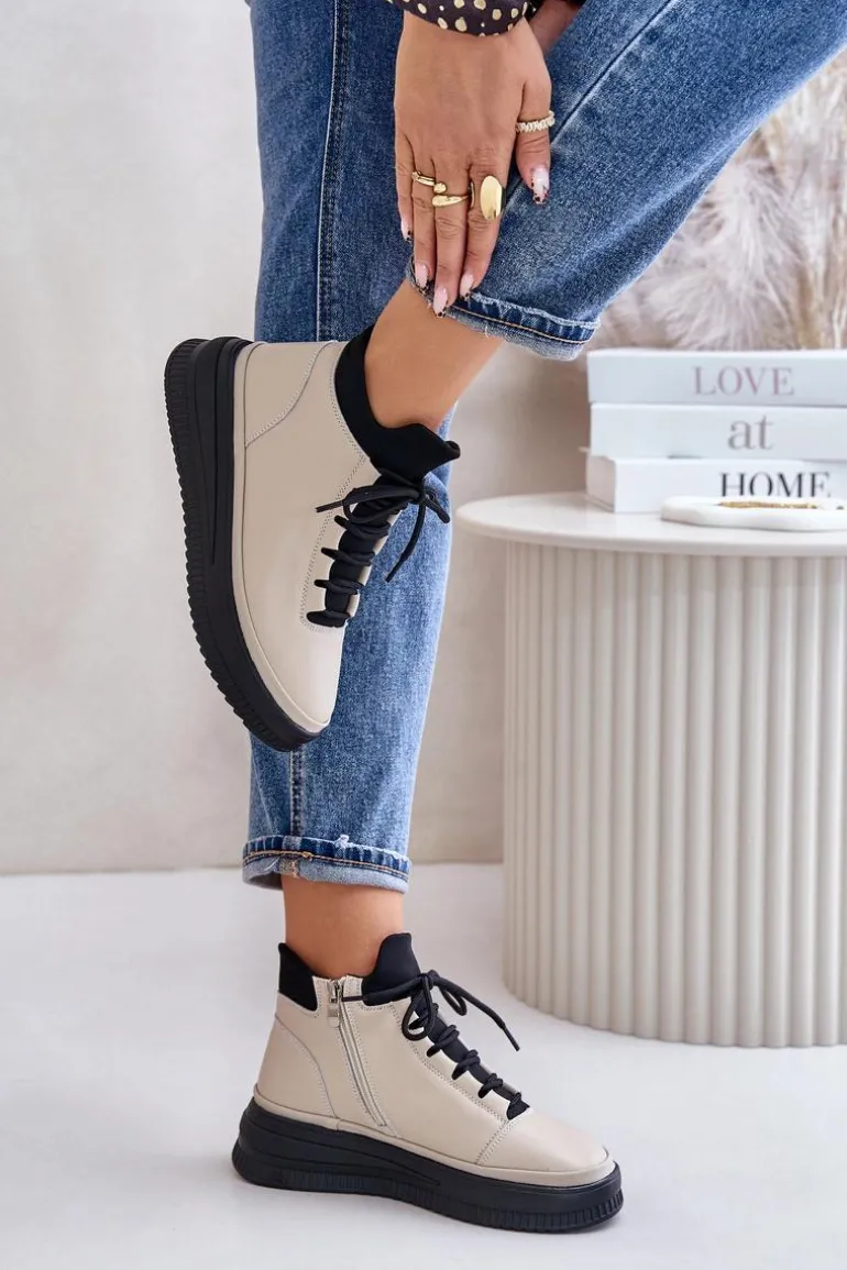 Sportowe buty wykonane z wysokiej jakości skóry naturalnej, które łączą styl z wygodą. Osadzone na modnej platformie, która dodaje charakteru i podkreśla nowoczesny design. Model zapinany na zamek, a dodatkowe sznurowanie pozwala na idealne dopasowanie do stopy. Zaokrąglone noski nadają całości subtelnego wyglądu. Te buty to must-have dla każdej kobiety, która ceni sobie zarówno modny wygląd, jak i komfort. Przy wyborze rozmiaru prosimy sugerować się tabelą rozmiarów.