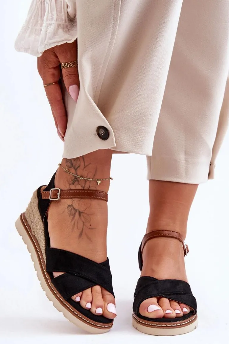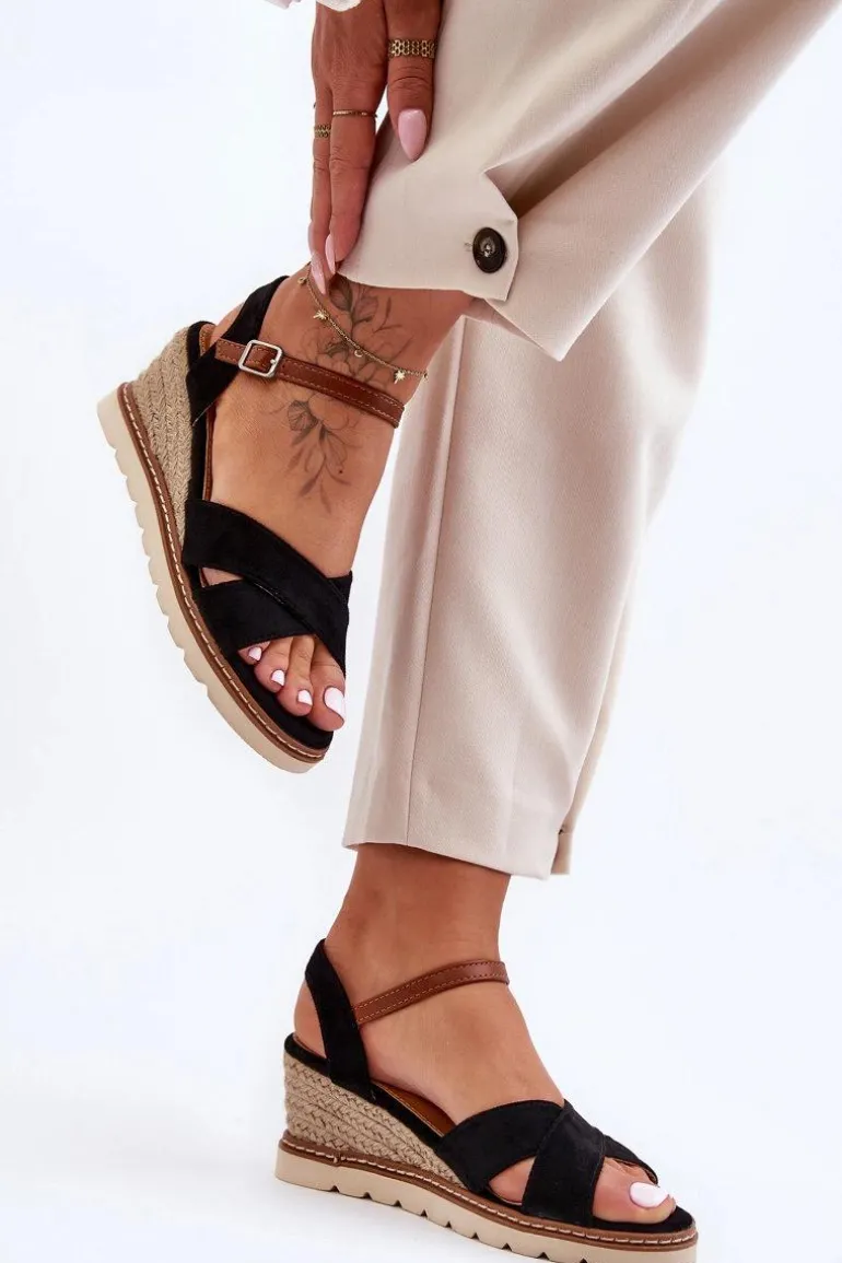Damskie sandały na koturnie ozdobionym jutową plecionką zostały wykonane z eko zamszu. Model ten posiada delikatną platformę. Zapinane na regulowany paseczek ze sprzączką. Miękka wkładka w sandałkach pozwoli na komfortowe użytkowanie obuwia. Przy wyborze rozmiaru prosimy sugerować się tabelą rozmiarów.