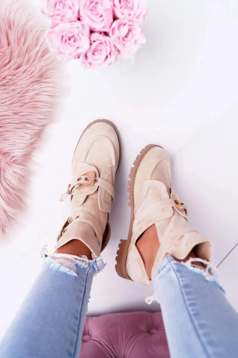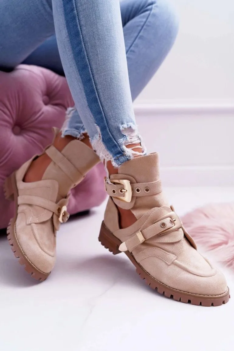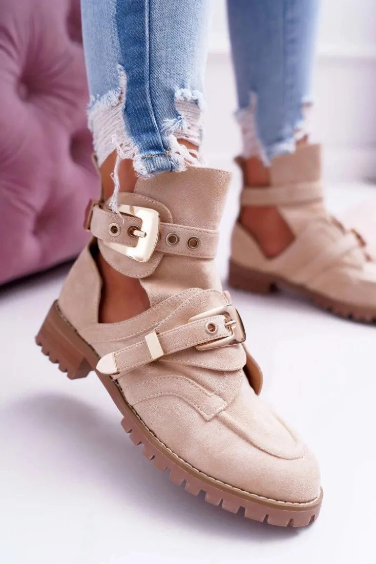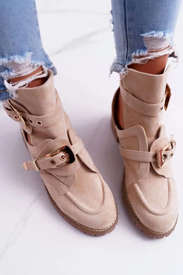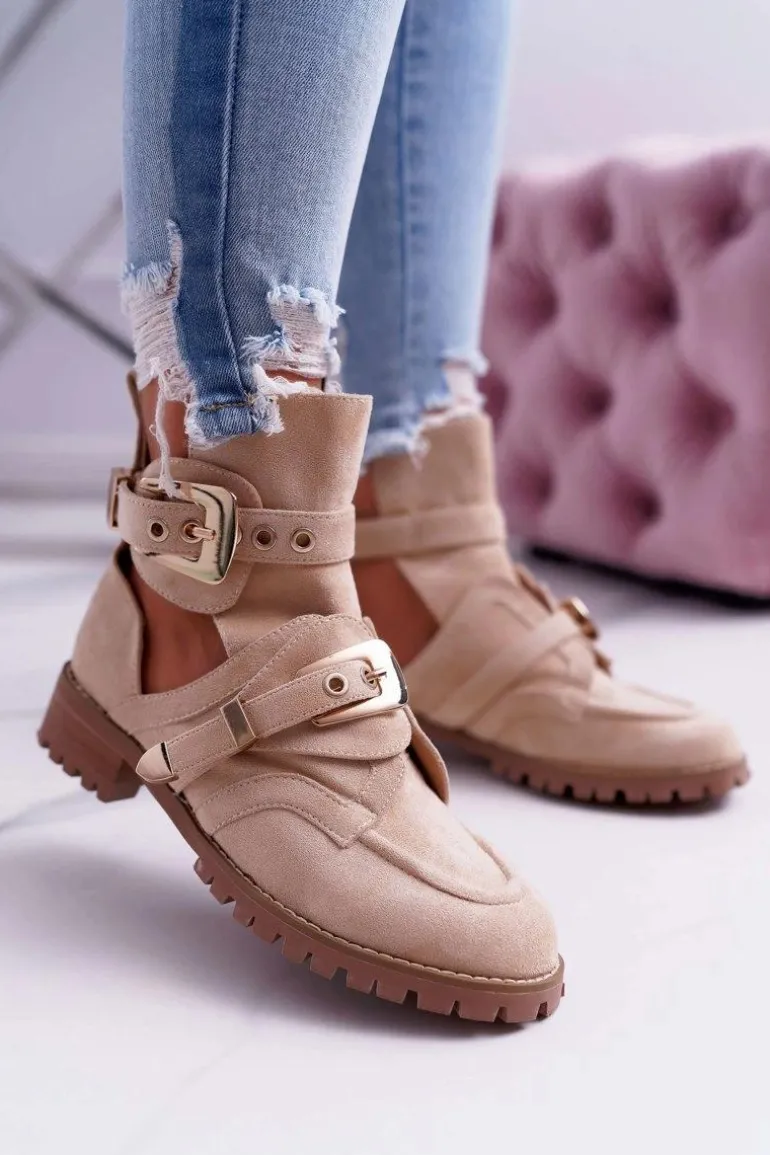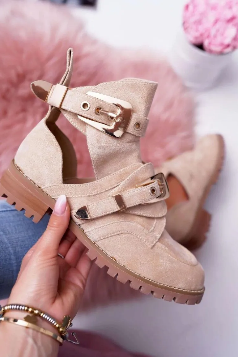 Jeśli chcesz zabłysnąć w świecie mody lub po prostu pokazać się z jak najlepszej strony, to te zamszowe botki będą idealne dla Ciebie. Bardzo wyczekiwane przez wiele kobiet! Wyglądają bardzo efektownie, a złote klamry nadają mocnego, rockowego charakteru. Posiadają unikalny design – są w częściowo wykrojone dzięki czemu zapewnią odpowiednią wentylację dla stopy. Wysoka, traktorowa podeszwa idealnie komponuje się z resztą obuwia. Nie czekaj dłużej i kup teraz póki jeszcze są dostępne!