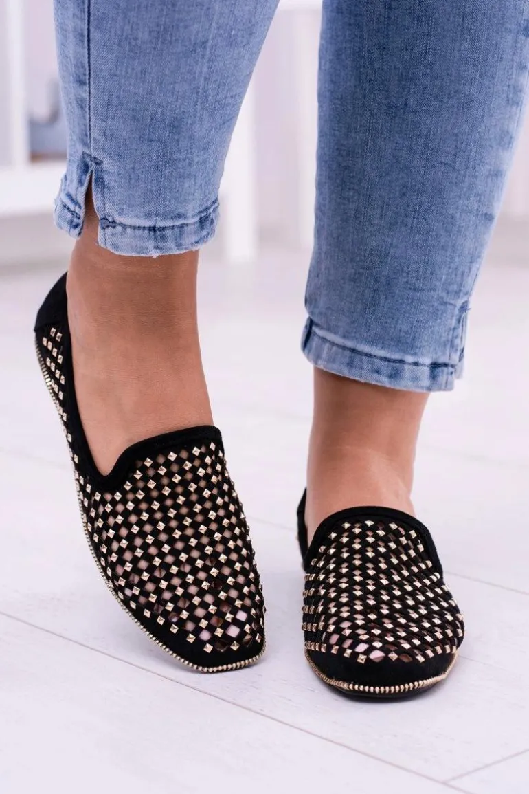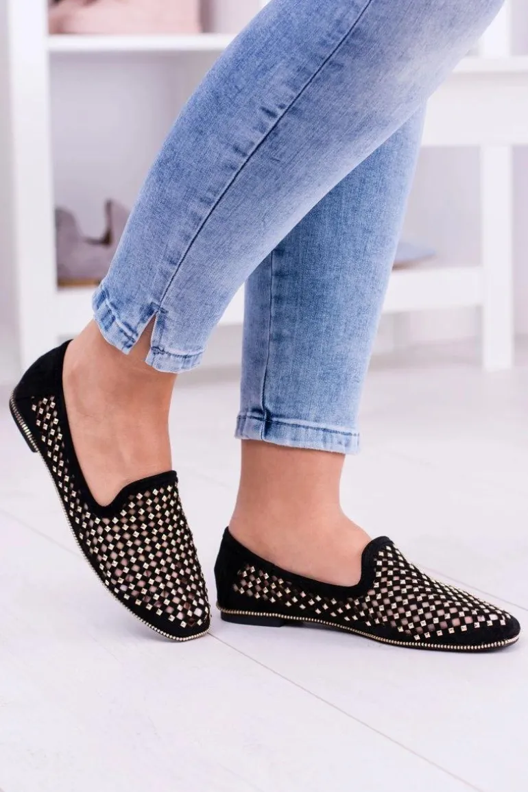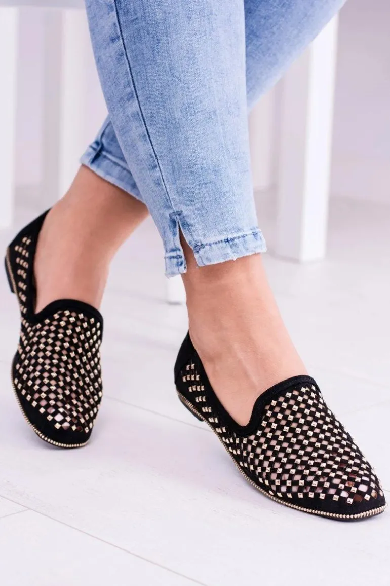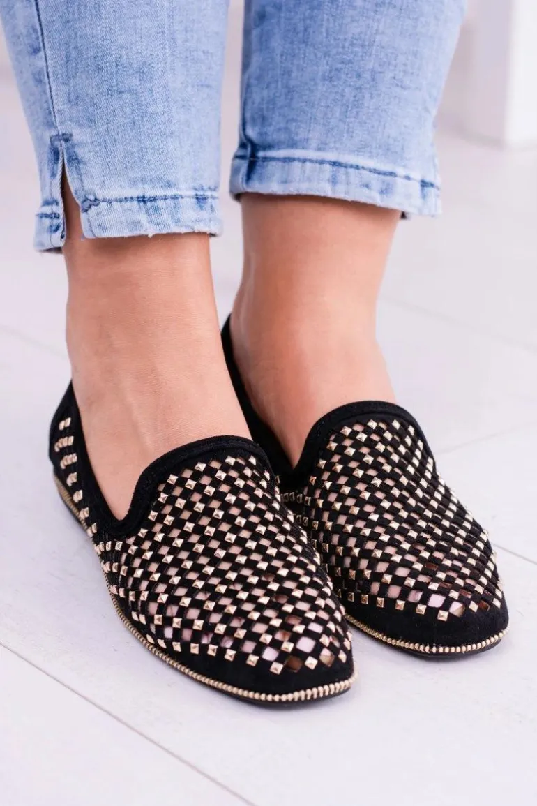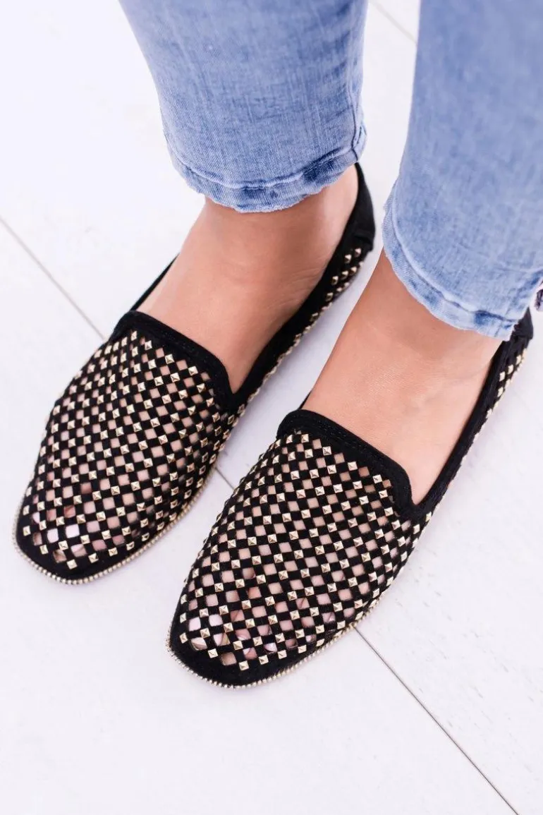 Lu Boo Czarne Ażurowe Baleriny Lordsy Ćwieki Carmar