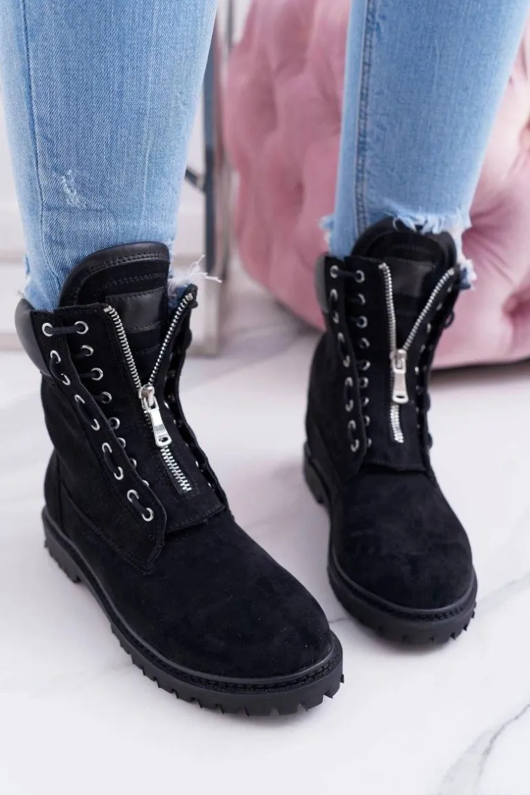 Lu Boo Czarne Zamszowe Damskie Timberki Trapery Suwaki Nancy