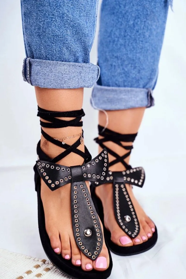 Lu Boo Damskie Czarne Wiązane Sandały Japonki Mara