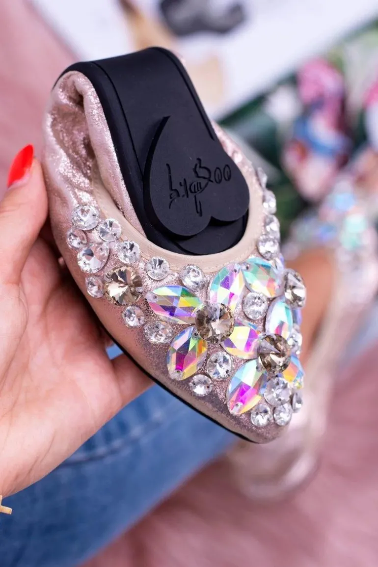 Lu Boo Złote Balerinki na Gumce Kamienie Even