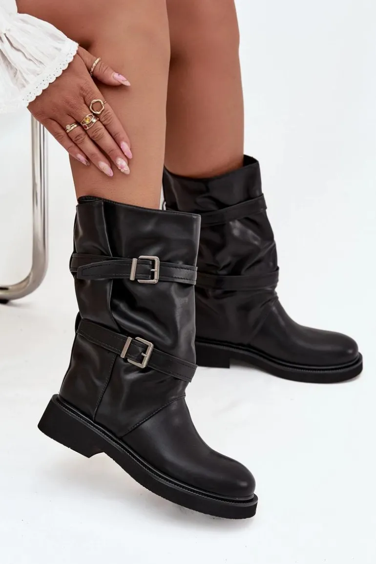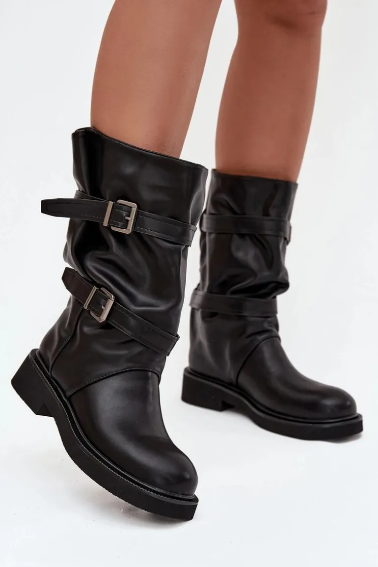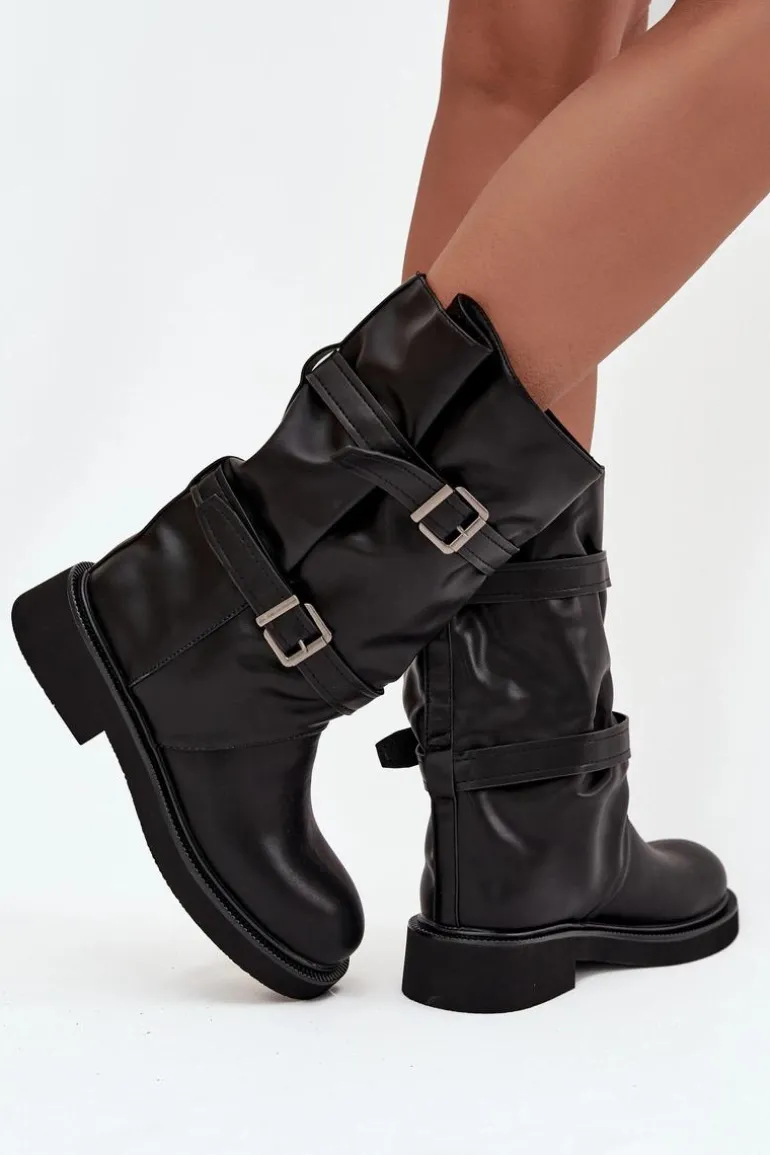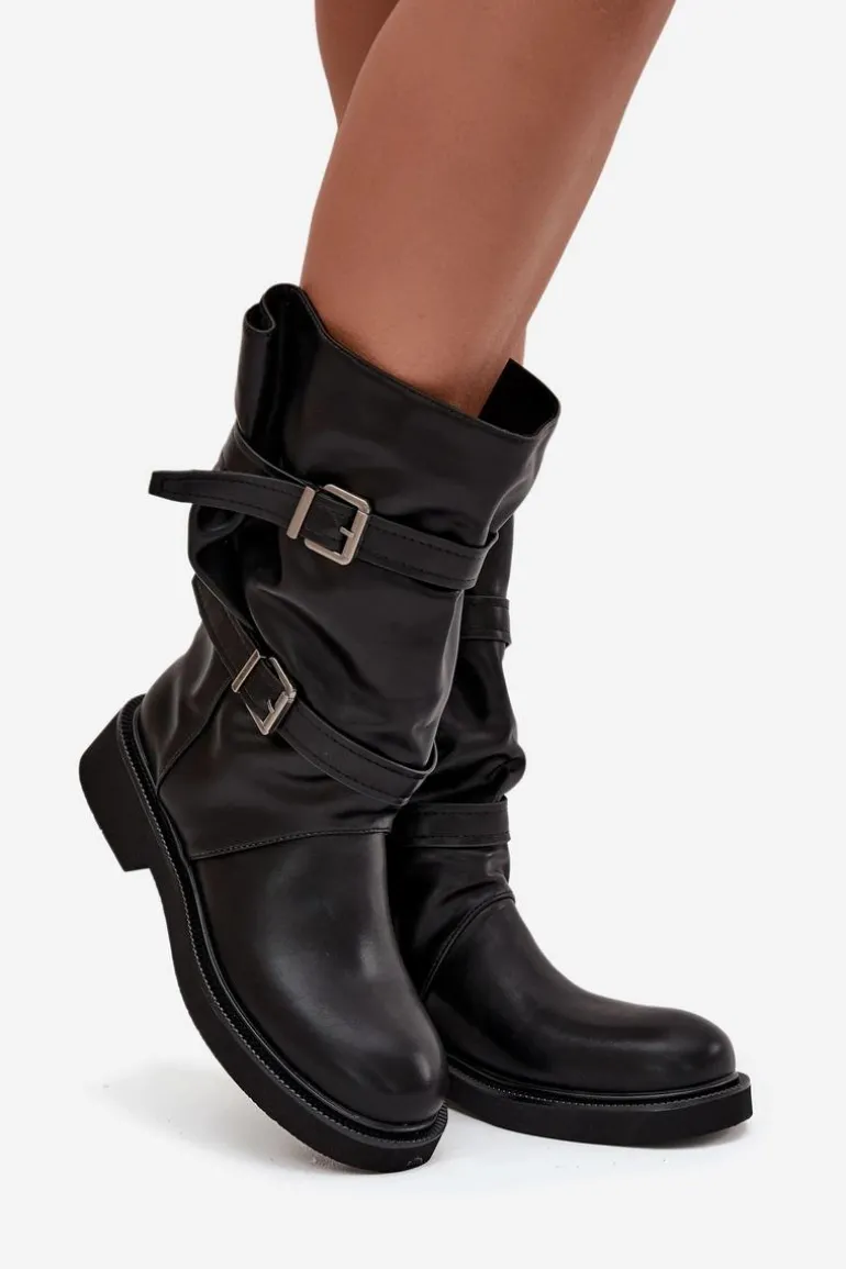 Kozaki damskie z eko skóry to modna i wygodna propozycja na chłodniejsze dni. Wykonane z eko skóry. Osadzone na płaskim obcasie, zapewniają komfort noszenia przez cały dzień, a ich praktyczny, wsuwany fason sprawia, że zakładanie butów jest szybkie i wygodne. Model wyróżnia marszczona cholewka sięgająca do połowy łydki. Całość uzupełniają ozdobne paski z klamrami, wprowadzające modny, nieco rockowy akcent. Te kozaki doskonale sprawdzą się zarówno w codziennych, casualowych zestawach ze spodniami czy legginsami, jak i w połączeniu z sukienką czy spódnicą. Przy wyborze rozmiaru prosimy kierować tabelą rozmiarów.