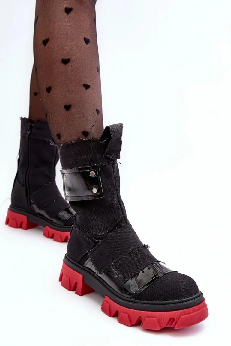 Botki damskie wykonane z połączenia materiału tekstylnego i eko skóry. Osadzone na płaskim obcasie i grubej podeszwie. Noski zaokrąglone. Miękka wkładka z eko skóry zapewni komfort podczas użytkowania. Usztywniony zapiętek. Nieocieplone. Przy wyborze rozmiaru prosimy sugerować się tabelą rozmiarów.