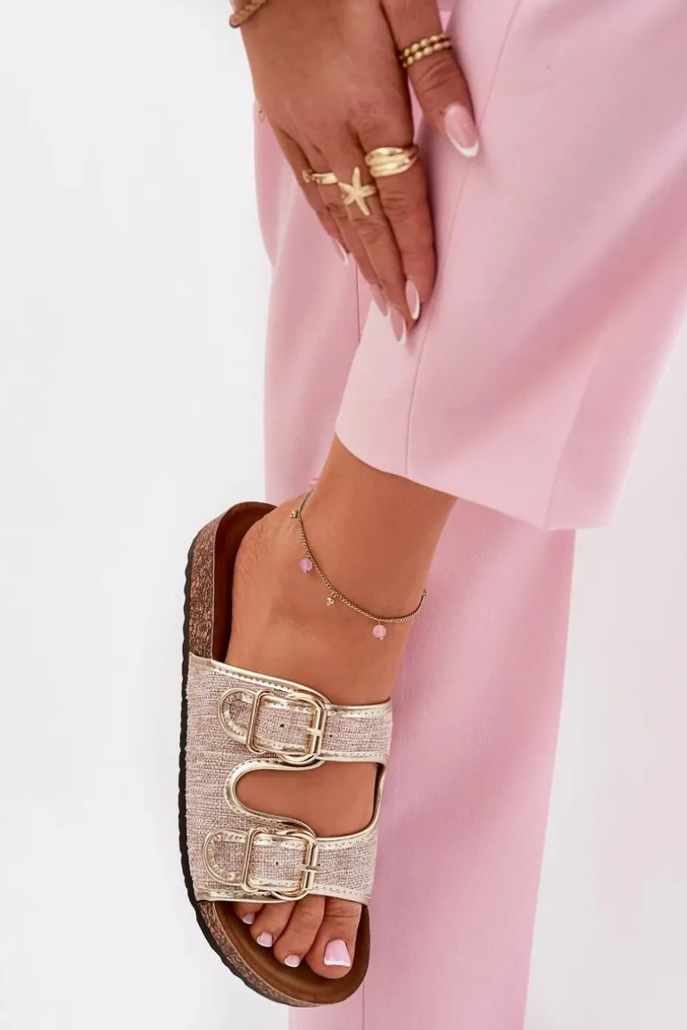 Materiałowe Klapki Damskie Na Korkowej Platformie Z Klamrami Złote Osoffe