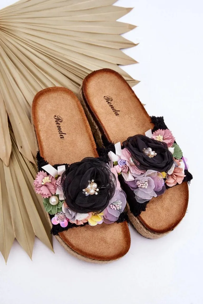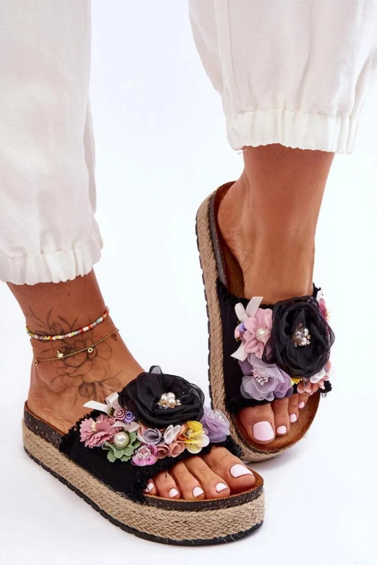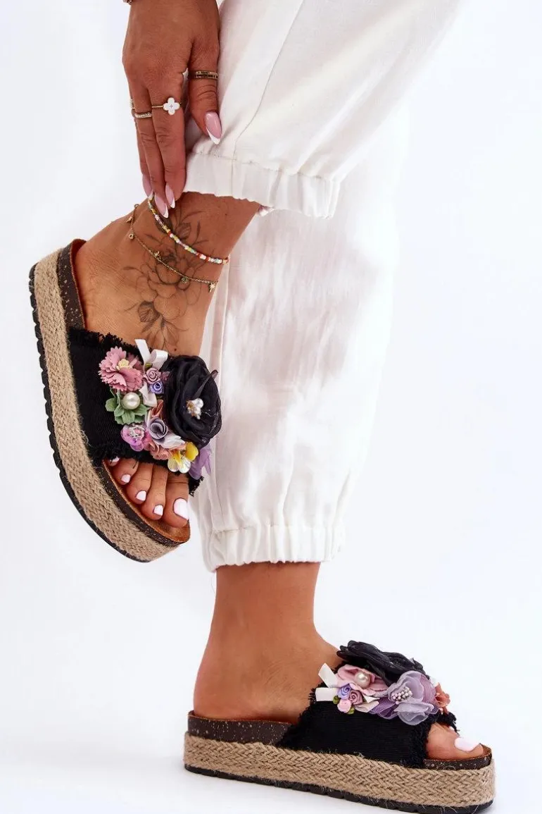 Niepowtarzalne, damskie klapki z cudnymi ozdobami w postaci materiałowych kwiatów i perełek. Osadzone na masywnej platformie ozdobionej jutową plecionką. Klapki posiadają profilowaną, eko zamszową wkładkę. Ten model z pewnością wyróżni Cię z tłumu! Przy wyborze rozmiaru prosimy sugerować się tabelą rozmiarów.