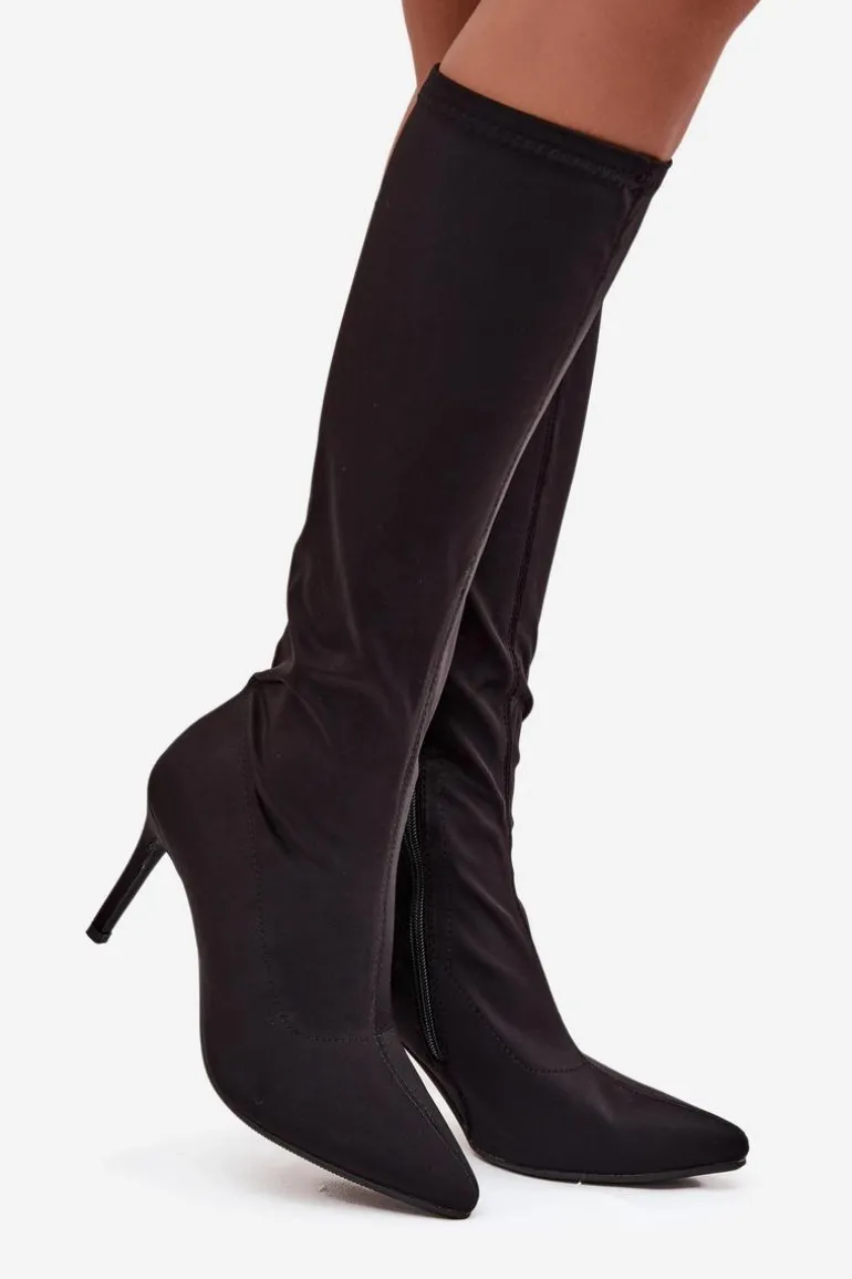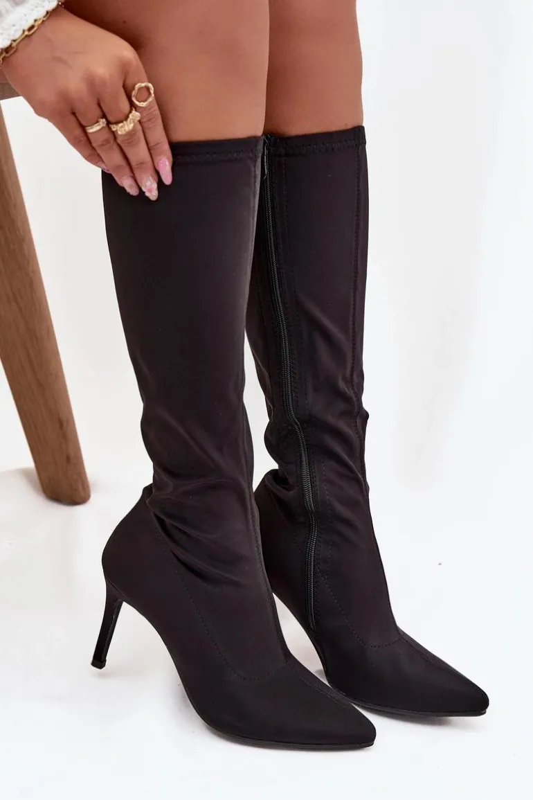 Kozaki damskie od marki S.Barski wykonane z wysokiej jakości materiału tekstylnego. Model osadzono na obcasie typu szpilka, który optycznie wydłuża nogi i podkreśla sylwetkę. Szpiczaste noski dodają subtelnej elegancji i wysmuklają stopę, a dekoracyjne przeszycia na cholewce wprowadzają modny detal, który podkreśla charakter butów. Praktyczne zapięcie na zamek ułatwia szybkie zakładanie i zdejmowanie, czyniąc kozaki funkcjonalnym elementem garderoby. To model idealny do stylizacji eleganckich i wieczorowych, który świetnie komponuje się zarówno z sukienkami, spódnicami, jak i dopasowanymi spodniami. Przy wyborze rozmiaru prosimy kierować tabelą rozmiarów.