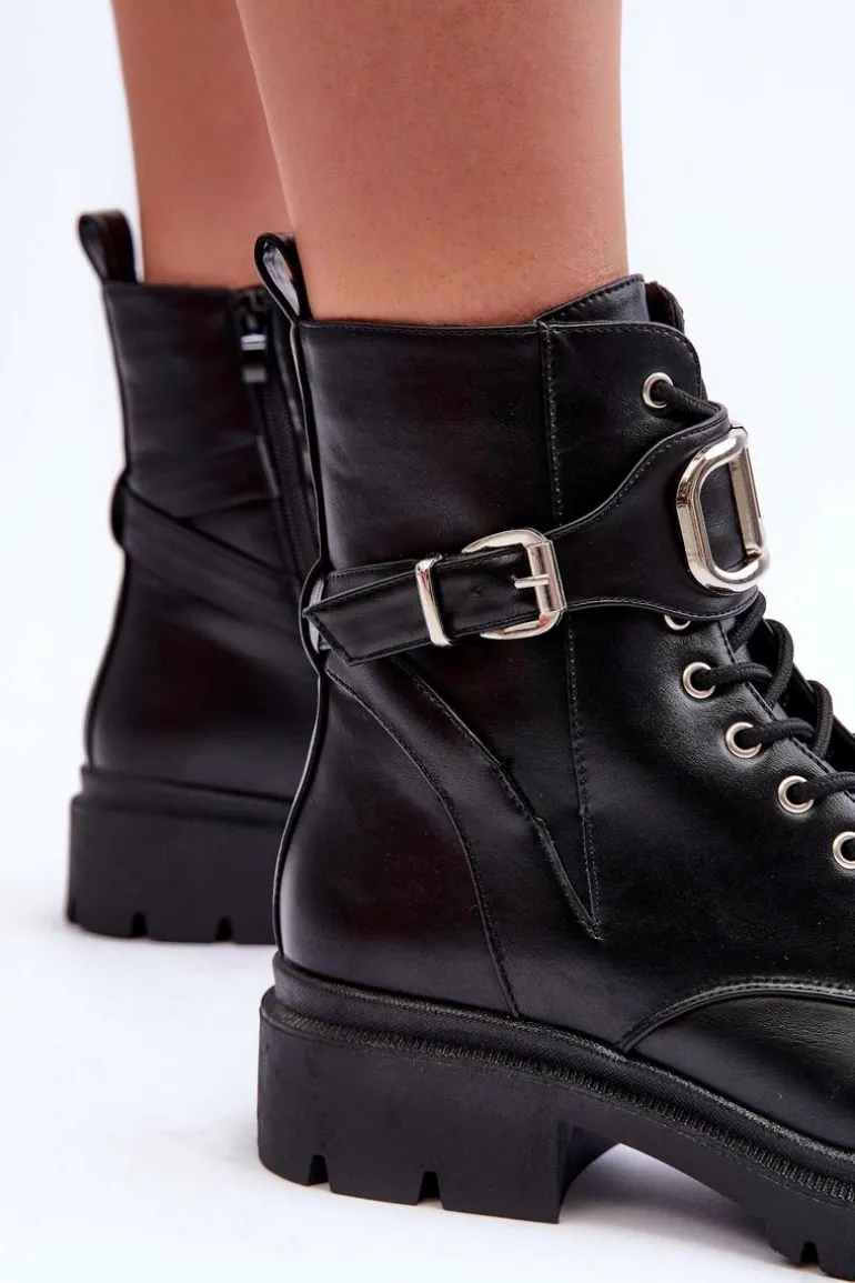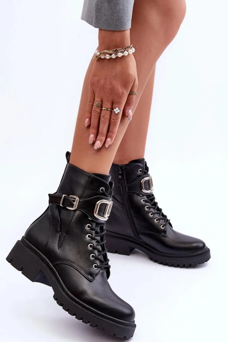 Modne, damskie workery na płaskim, masywnym obcasie i platformie. Wykonane zostały z eko skóry. Model ten zapinany jest na zamek i dodatkowo posiada sznurówki. Na pasku znajduje się ozdoba z tworzywa sztucznego oraz klamra. Świetnie sprawdzą się do wielu stylizacji! Przy wyborze rozmiaru prosimy sugerować się tabelą rozmiarów.