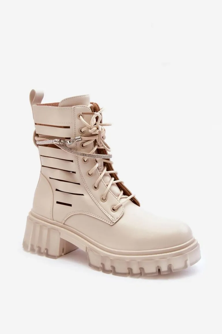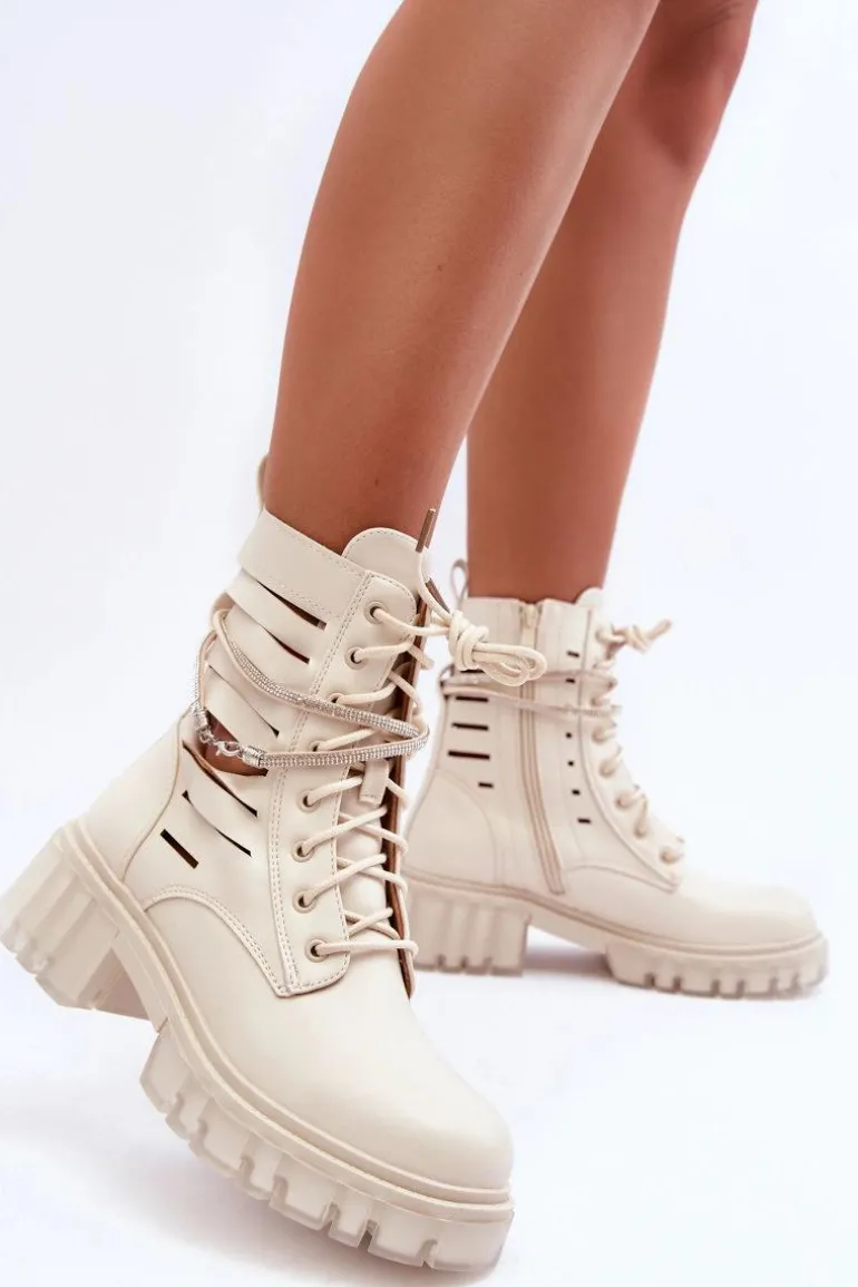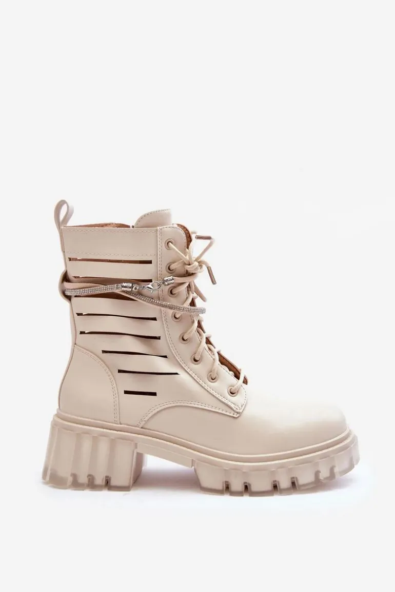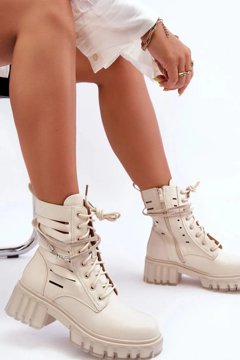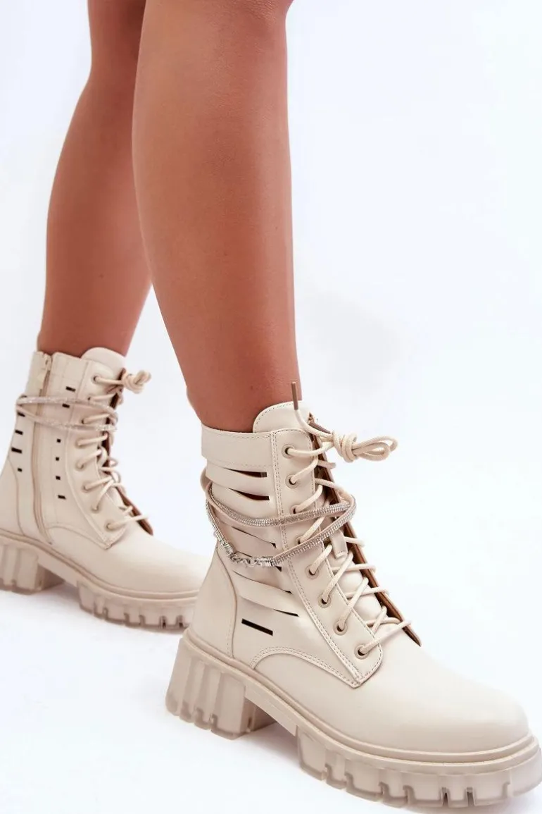 Niezwykłe i stylowe botki wykonane z eko skóry. Zapinane są z boku cholewki na zamek oraz dodatkowo sznurowane. Botki posiadają usztywniany zapiętek. Ozdobny, odpinany paseczek został wzbogacony dżetami imitującymi cyrkonie. Botki zostały wykonane z eko skóry z modnymi przecięciami. Osadzono je na masywnym, płaskim obcasie i platformie. Przy wyborze rozmiaru prosimy sugerować się tabelą rozmiarów.