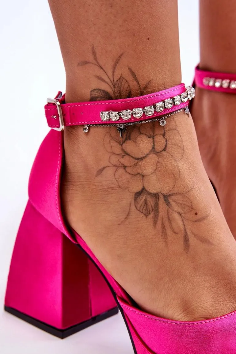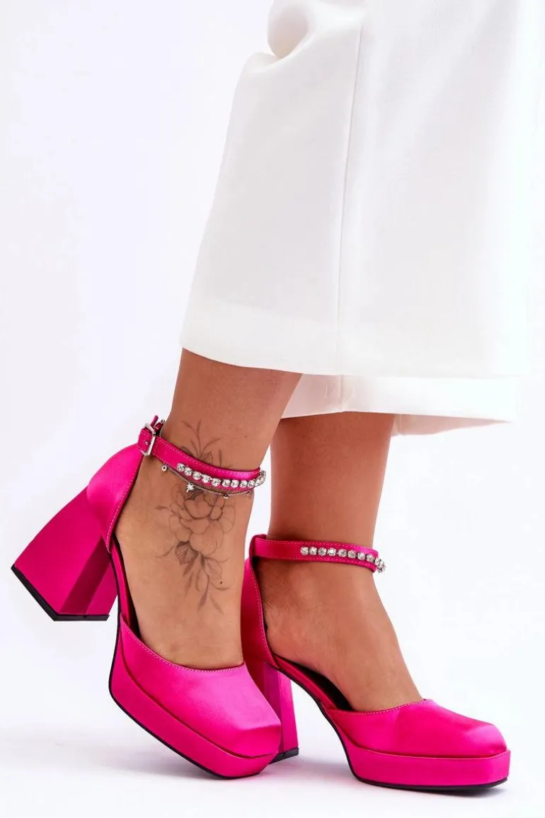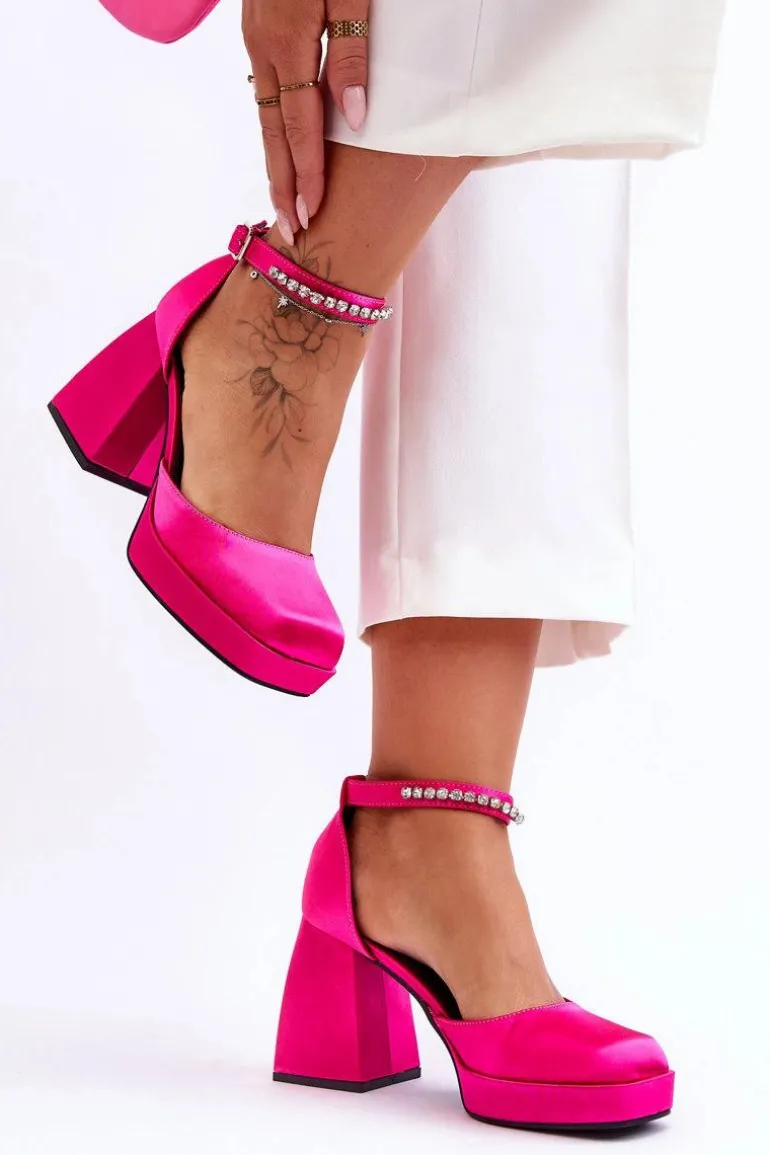 Czółenka zostały wykonane z materiału tekstylnego. Osadzone na platformie oraz obcasie w postaci stabilnego, masywnego klocka. Miękka wkładka z eko skóry zapewni komfortowe użytkowanie. Czółenka są zapinane na regulowany pasek ze sprzączką, który został dodatkowo ozdobiony dżetami imitującymi cyrkonie. Zapiętek został usztywniony. Przy wyborze rozmiaru prosimy sugerować się tabelą rozmiarów.