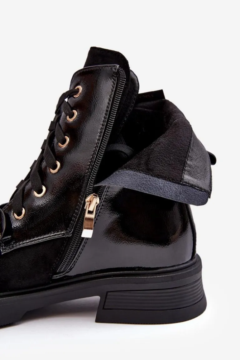 Damskie botki zostały wykonane z wysokiej jakości eko skóry. Osadzono je na płaskim obcasie i platformie. Z przodu posiadają sznurowanie, natomiast z boku cholewki znajduje się suwak ułatwiający zakładanie obuwia. Środek ocieplono miłym w dotyku kocem obuwniczym. Dodatkowo model ten ozdobiono kwiatami z materiału i tworzywa sztucznego. Ten model na pewno wykorzystasz w wielu stylizacjach! Przy wyborze rozmiaru prosimy sugerować się tabelą rozmiarów.
