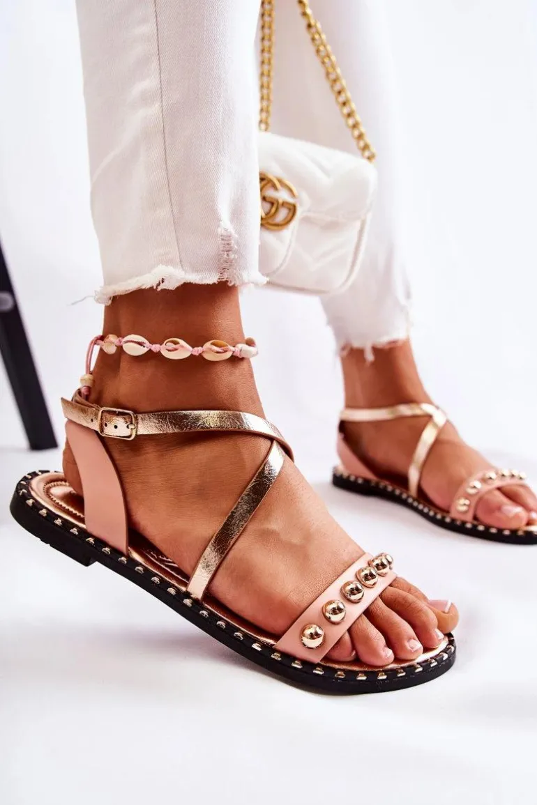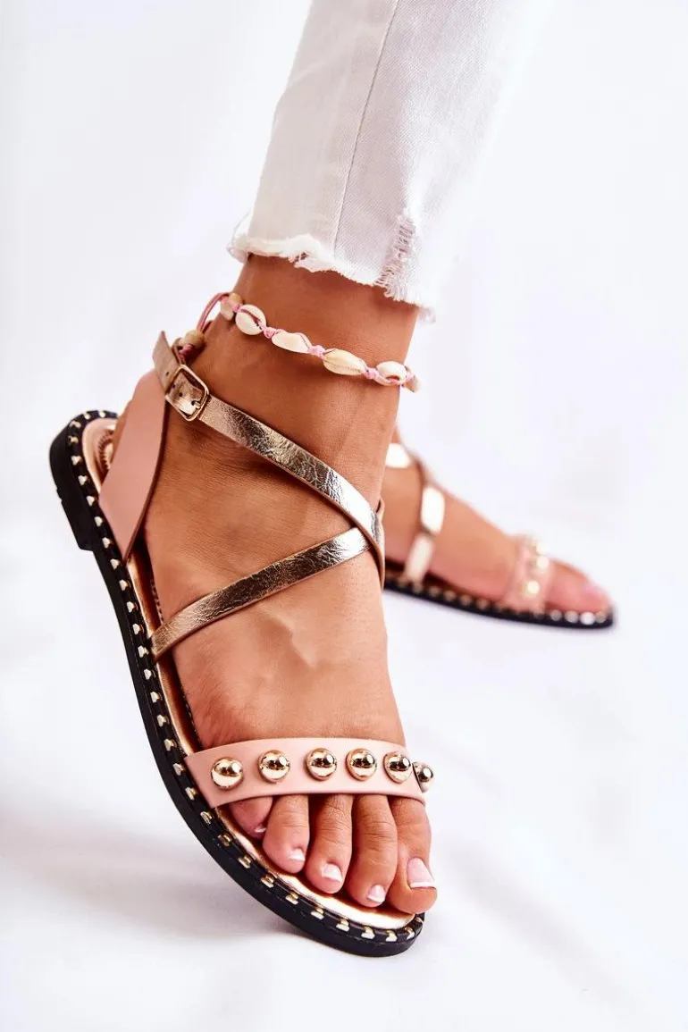 Modne, a zarazem wygodne sandały na płaskim obcasie zostały wykonane z eko skóry. Posiadają dekoracyjne zdobienia wokół podeszwy. Modny fason z przeplatającymi się paskami. Wkładka jest także wykonana z eko skóry z dodatkowym pikowaniem. Model zapinany wokół kostki na regulowany pasek ze sprzączką. Ozdoby w postaci dżetów znajdują się na przednim pasku obuwia. Podeszwa wykonana z gumowego tworzywa, antypoślizgowa. Przy wyborze rozmiaru prosimy kierować się tabelą rozmiarów.