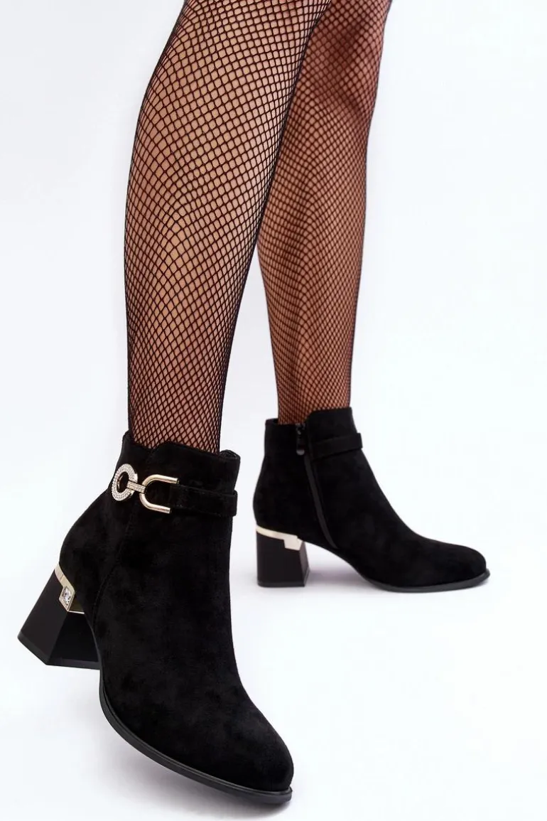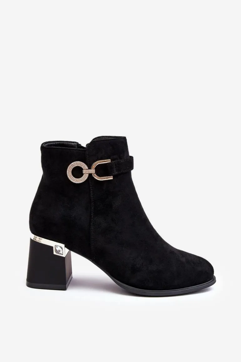 Rewelacyjne, damskie botki zostały osadzone na zdobionym obcasie w postaci słupka. Model ten został wykonany z eko zamszu. Na cholewce z boku umieszczono ozdobę z dżetami, natomiast z drugiej strony suwak ułatwiający zakładanie obuwia. Środek tego botka nie jest ocieplony. Usztywniony zapiętek zapewni stabilizację. Przy wyborze rozmiaru prosimy sugerować się tabelą rozmiarów.