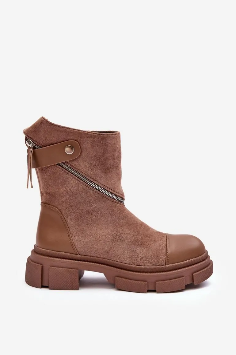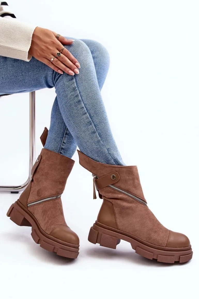 Wyjątkowe botki damskie zapinane na zamek błyskawiczny oraz napę. Wyjątkowy fason zachwyci niejedną miłośniczkę modowych nowości! Botki zostały wykonane z połączenia eko skóry oraz eko zamszu. Środek ocieplony przyjemnym w dotyku futerkiem. Osadzone na platformie i obcasie w postaci słupka. Nieregularne zakończenie cholewki dodaje charakteru tym butom! Przy wyborze rozmiaru prosimy sugerować się tabelą rozmiarów.