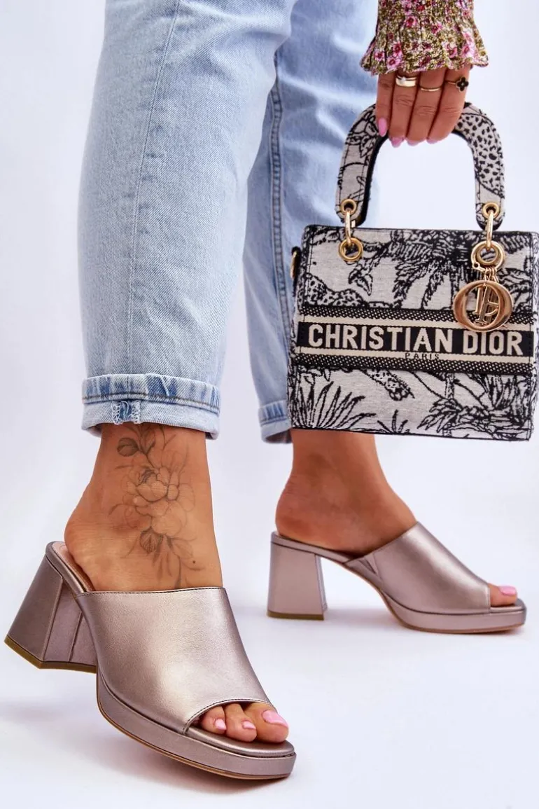 Klasyczne klapki damskie zostały osadzone na obcasie w postaci słupka. Wykonane w całości z eko skóry. Posiadają modne paseczki przeplatające się ze sobą. Miękka wkładka zapewni wygodę nawet przez cały dzień. Modny, klasyczny fason z odkrytym, zaokrąglonym noskiem. Przy wyborze rozmiaru prosimy kierować się tabelą rozmiarów.