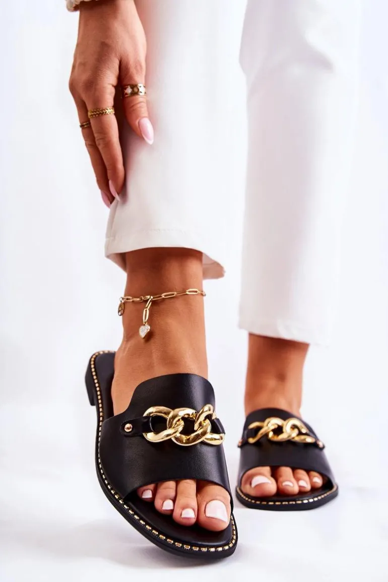 Modne Klapki Z Łańcuchem Na Płaskim Obcasie Czarne Finess