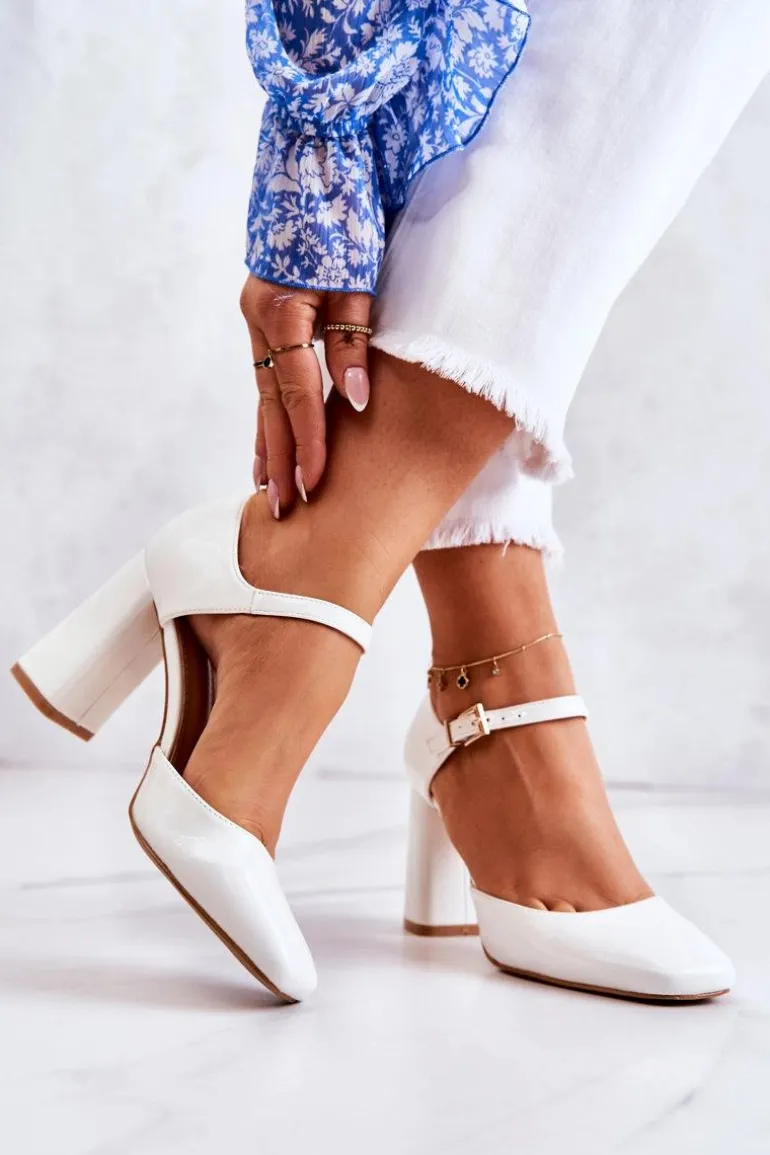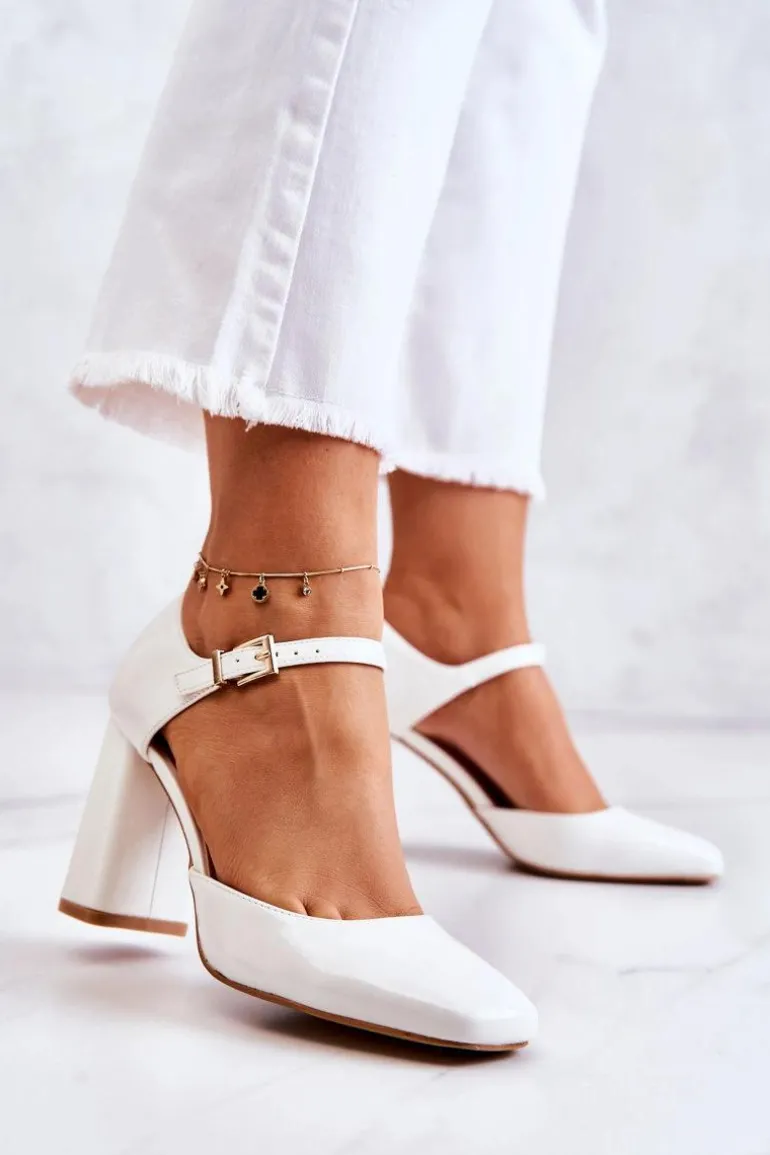 Klasyczne czółenka wykonane z lakierowanej eko skóry. Pięknie prezentują się na nodze. Obcas w postaci stabilnego słupka. Zapinane wokół kostki na regulowany pasek ze sprzączką. Nosek zakryty, kwadratowy. Miękka, wykonana z eko skóry wkładka zapewni komfort na każdym kroku. Modne i stylowe czółenka doskonale będą komponować się z eleganckimi, szerokimi spodniami czy z sukienką o fasonie marynarki. Uniwersalność, elegancja i wygoda – te cechy idealnie określają ten model czółenek! Przy wyborze rozmiaru prosimy kierować się tabelą rozmiarów