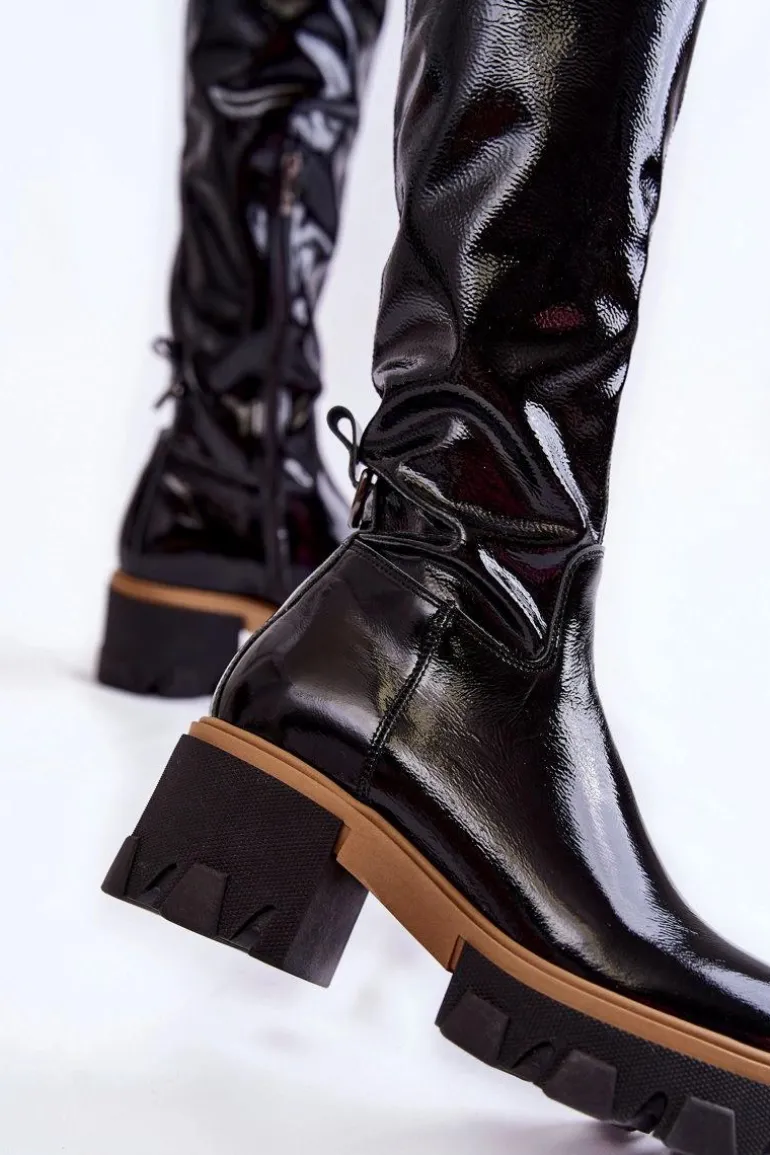 Wyjątkowe kozaki muszkieterki zostały wykonane z wysokiej jakości naturalnej skóry. Model wsuwany, z suwakiem na boku. Kozaki osadzono na masywnym obcasie i platformie ze żłobieniami. Zapiętek jest usztywniany. W środku zostały ocieplone na wysokości stopy kocem obuwniczym, a na pozostałej wysokości materiałem. Przy wyborze rozmiaru prosimy kierować tabelą rozmiarów.